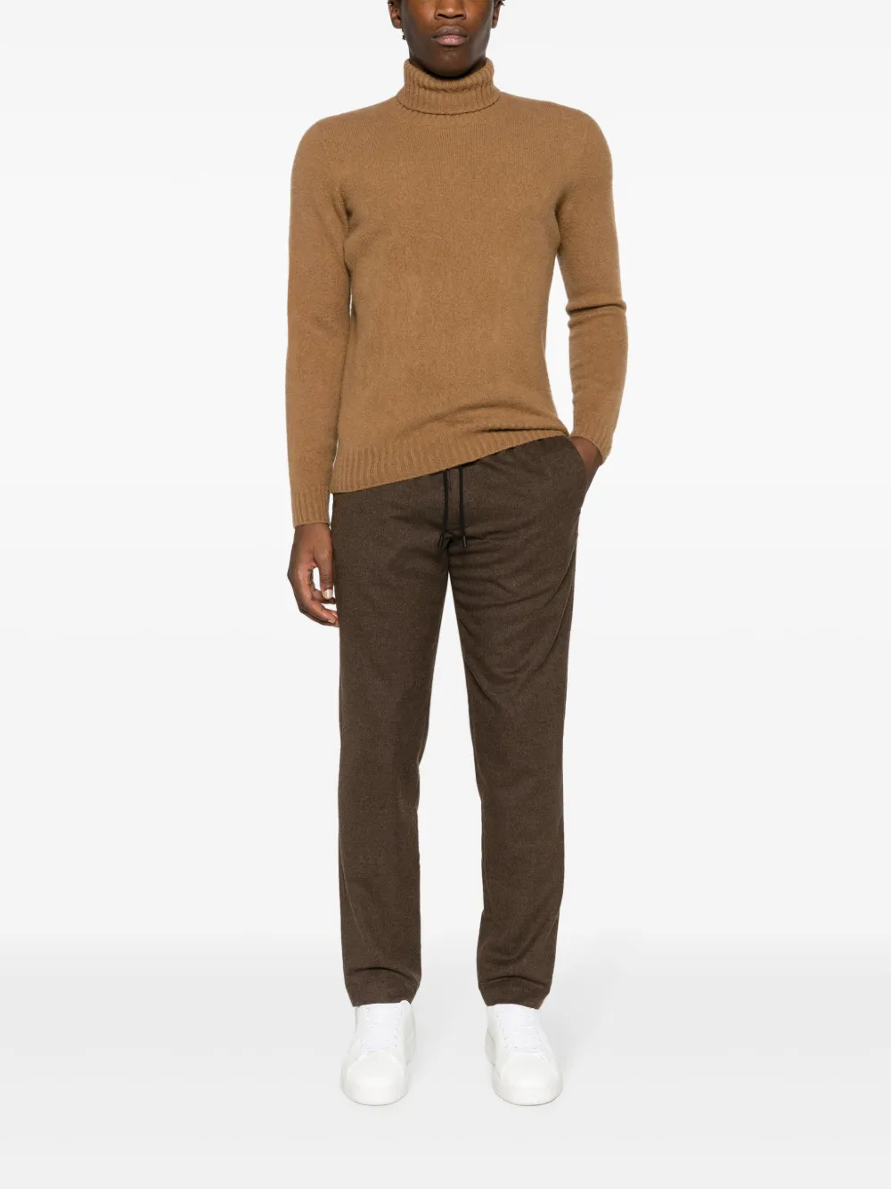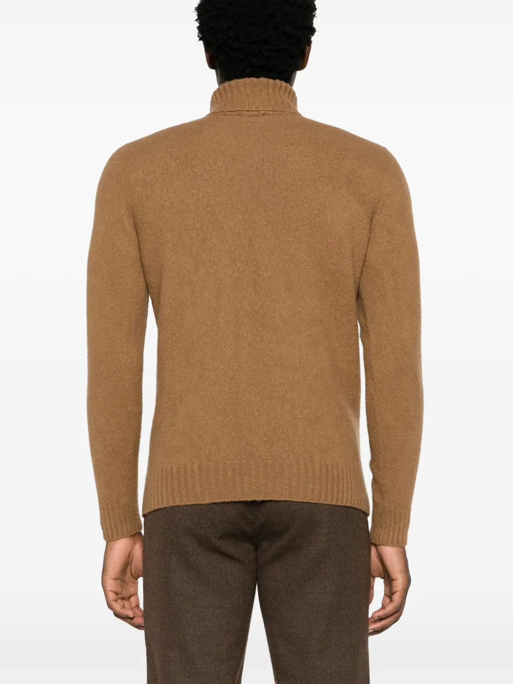 Бежево-коричневый, овечья шерсть, трикотажный материал, матовый эффект, высокий воротник, длинные рукава и прямой подол.