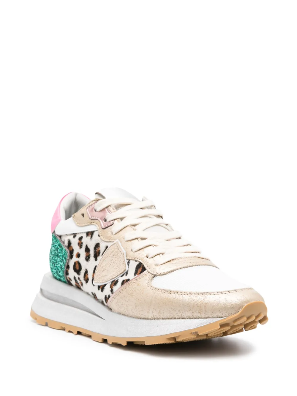 Разноцветный, телячья кожа, леопардовый принт, вставки, нашивка с логотипом сбоку, нашивка с логотипом на язычке, блестящий материал, контрастный задник с логотипом, миндалевидный носок, шнуровка спереди, стелька с логотипом и массивная резиновая подошва.
