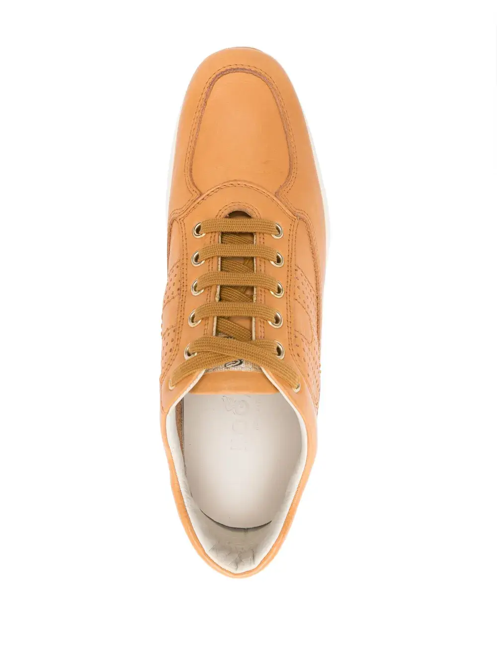 Бежевый, телячья кожа, гладкая текстура кожи, миндалевидный носок, перфорированный логотип, шнуровка спереди, кожаная стелька с логотипом и массивная резиновая подошва.
