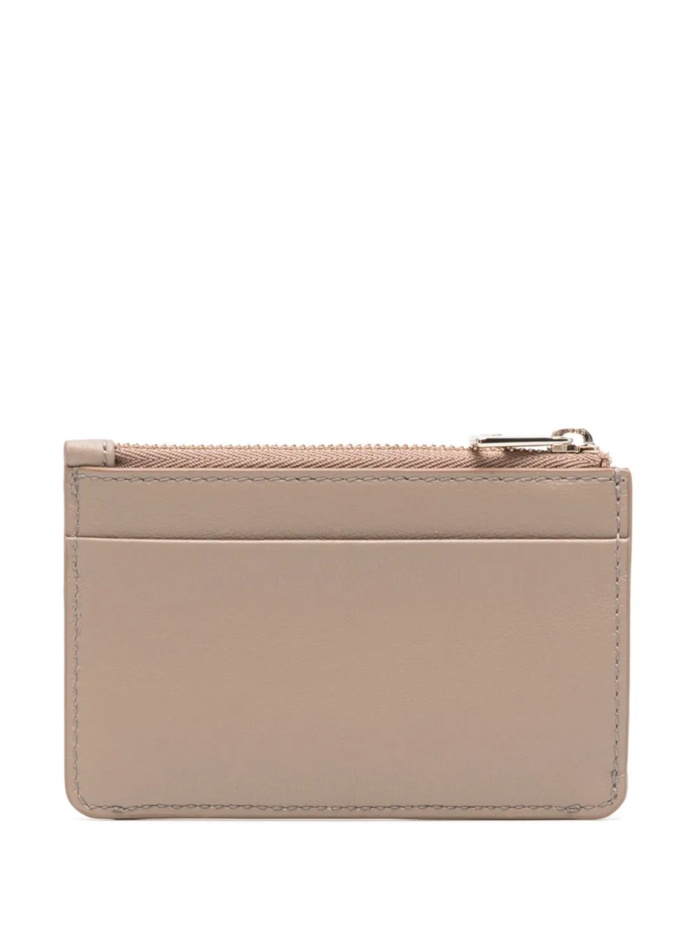 Бежевый, телячья кожа, гладкая текстура кожи, прямоугольная форма, застежка на молнии сверху, металлический логотип, отделения для карт и строчка в тон.