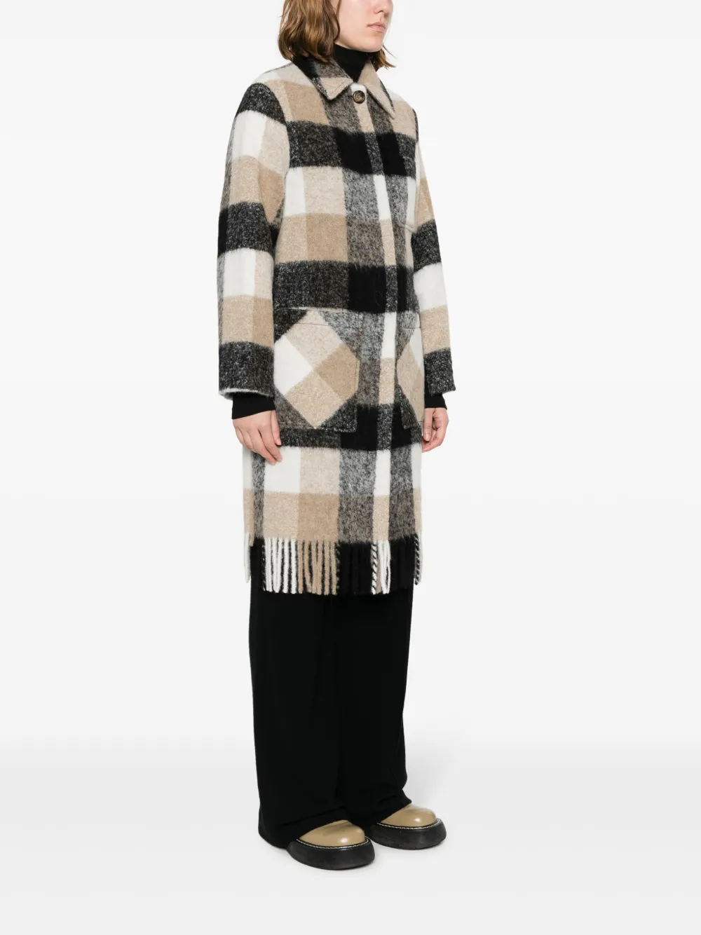Бежевый, черный, клетчатый узор, потайная застежка спереди, плоский заостренный воротник, нагрудный накладной карман, два накладных кармана по бокам, длинные рукава и края с бахромой.