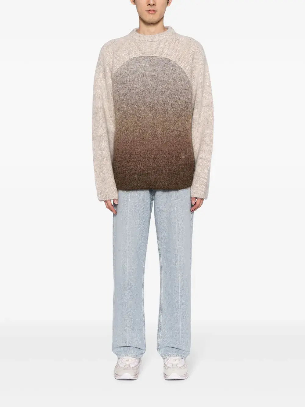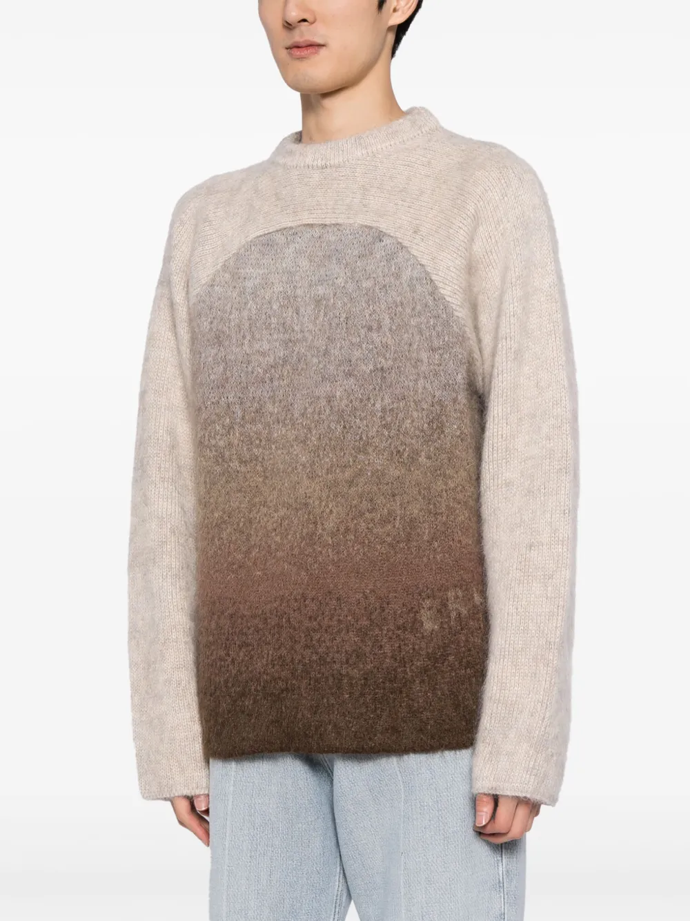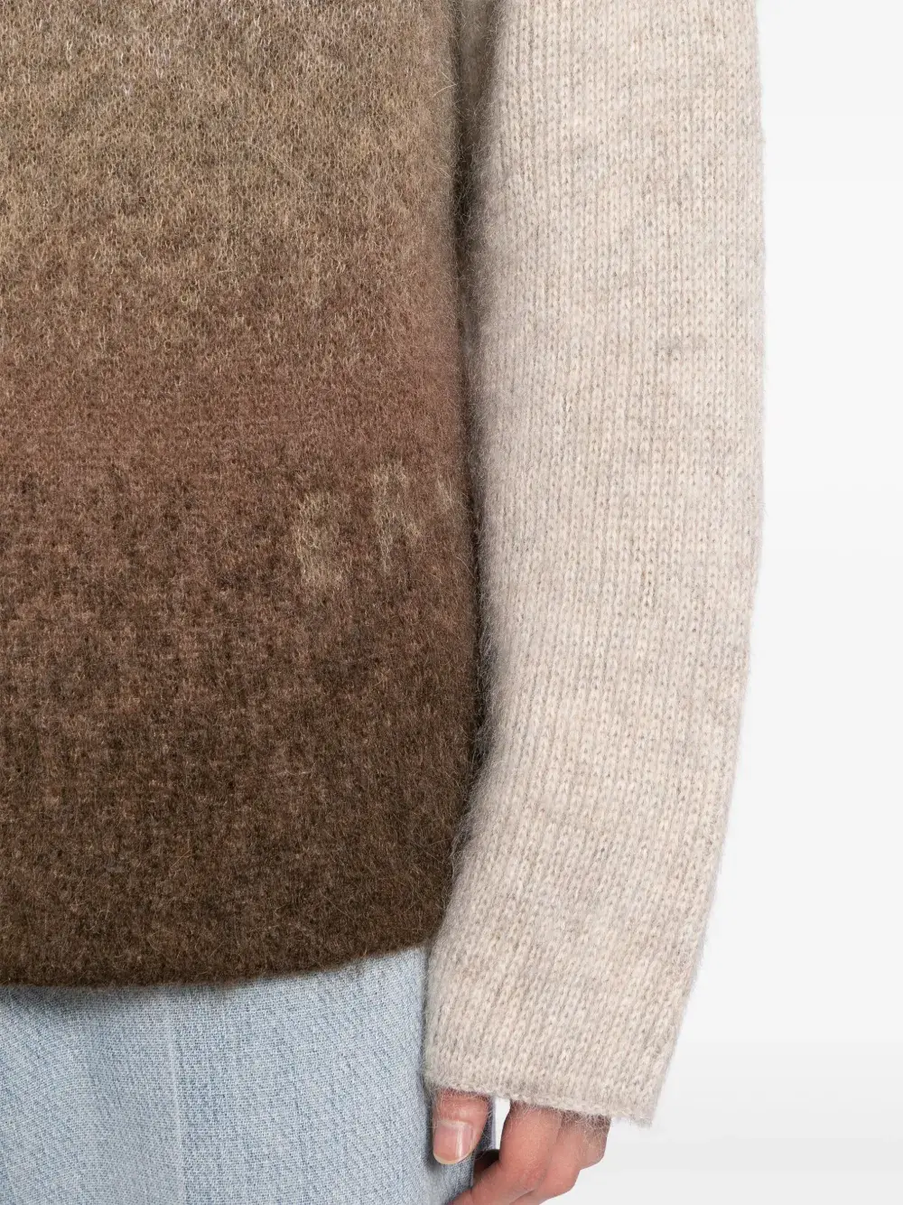 Бежевый, кофейный, смесь мохера и шерсти, трикотажный материал, матовое покрытие, вставки, вязаные края в рубчик, градиентный эффект, круглый вырез и длинные рукава реглан.