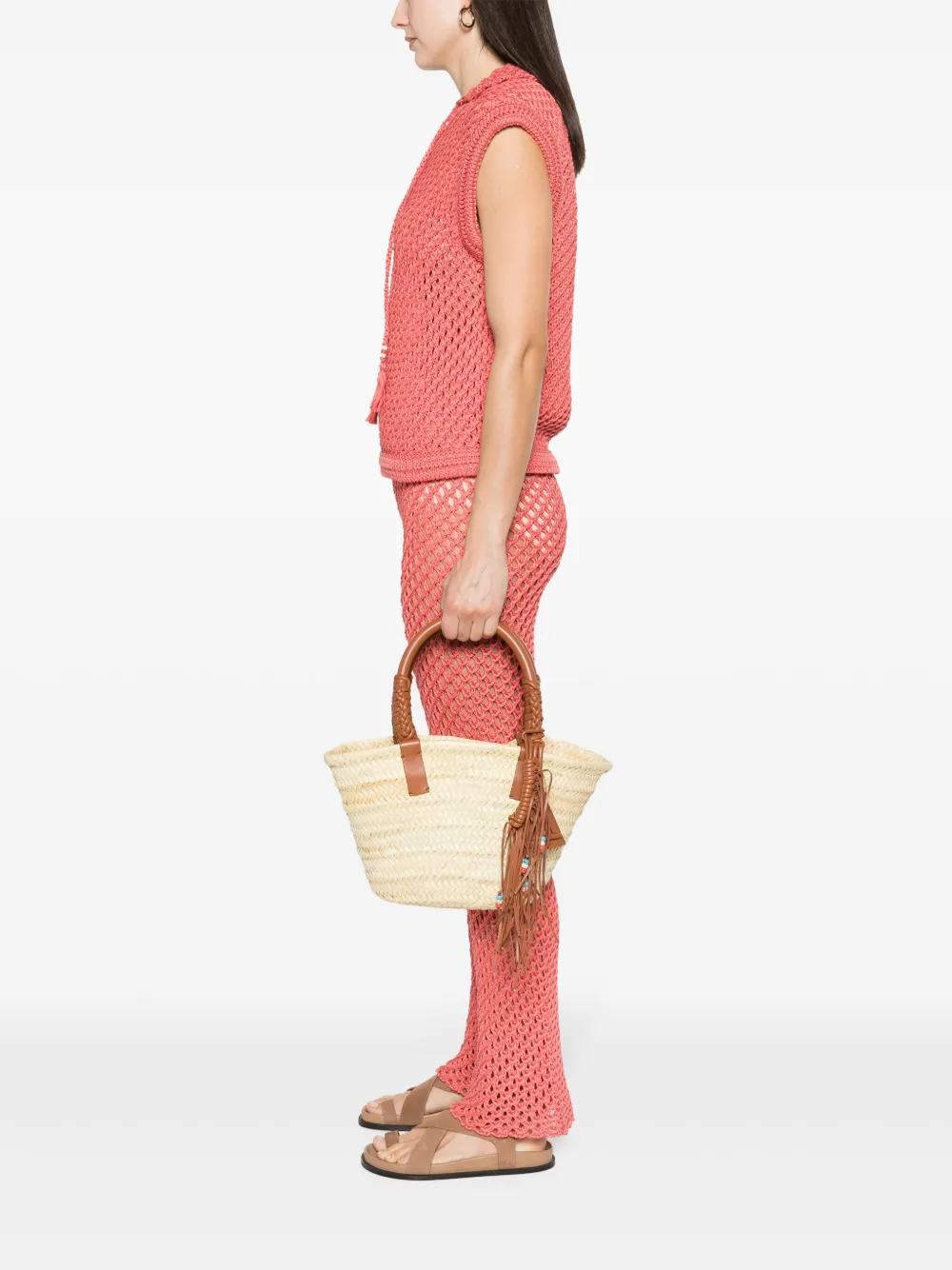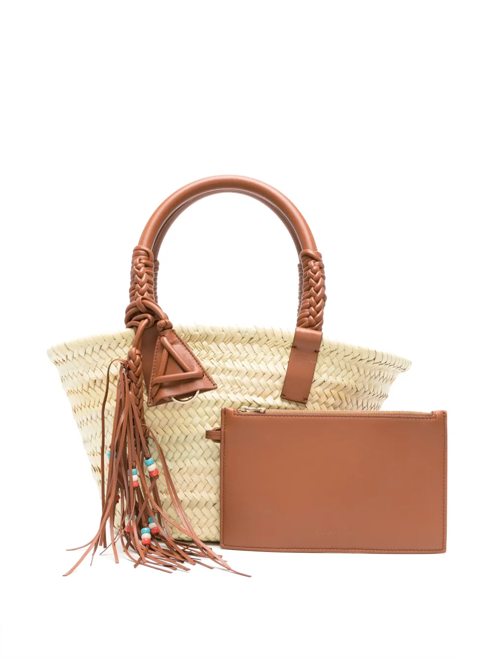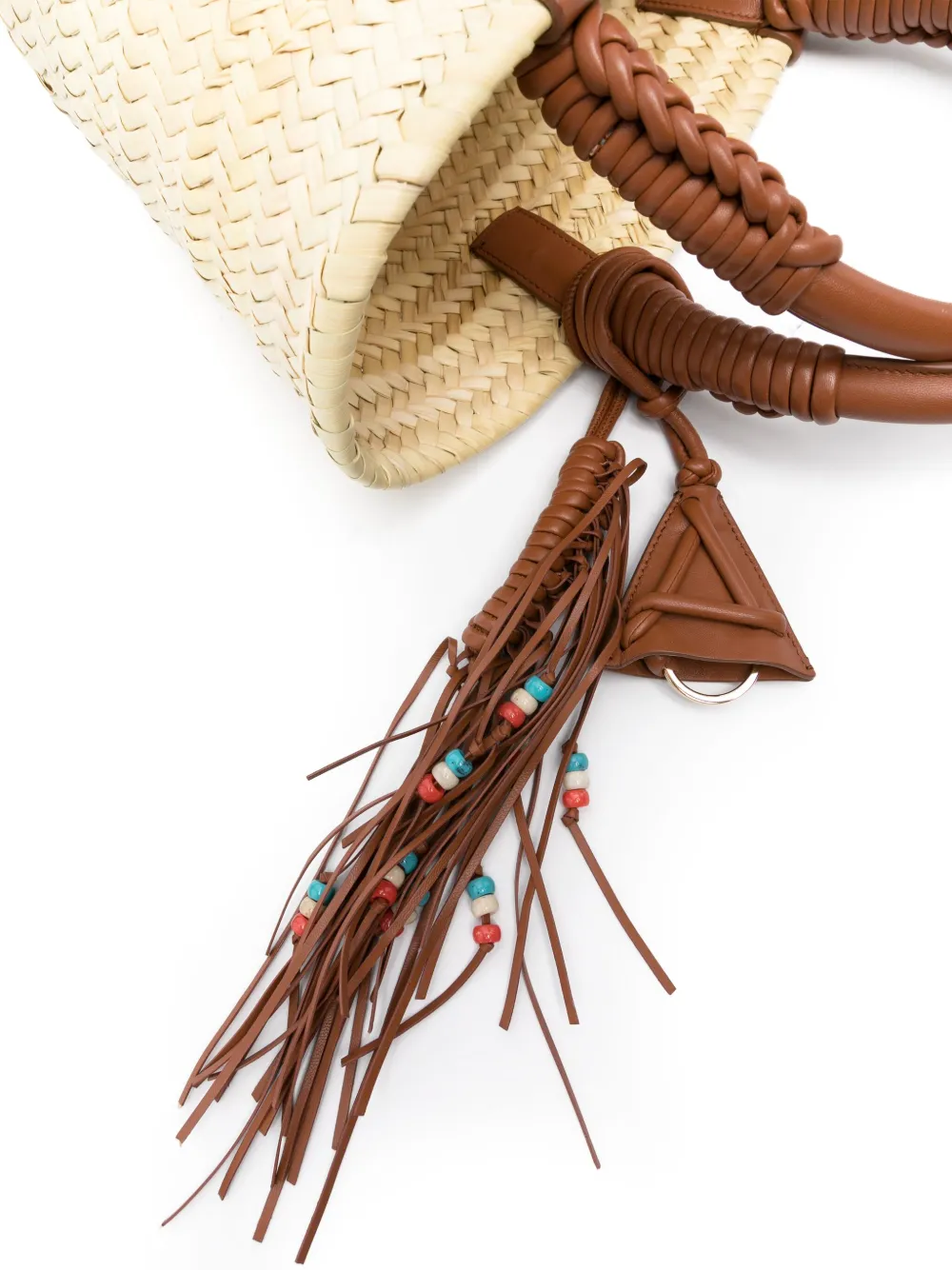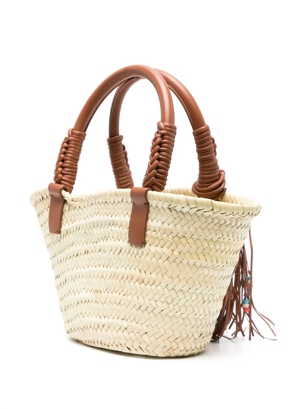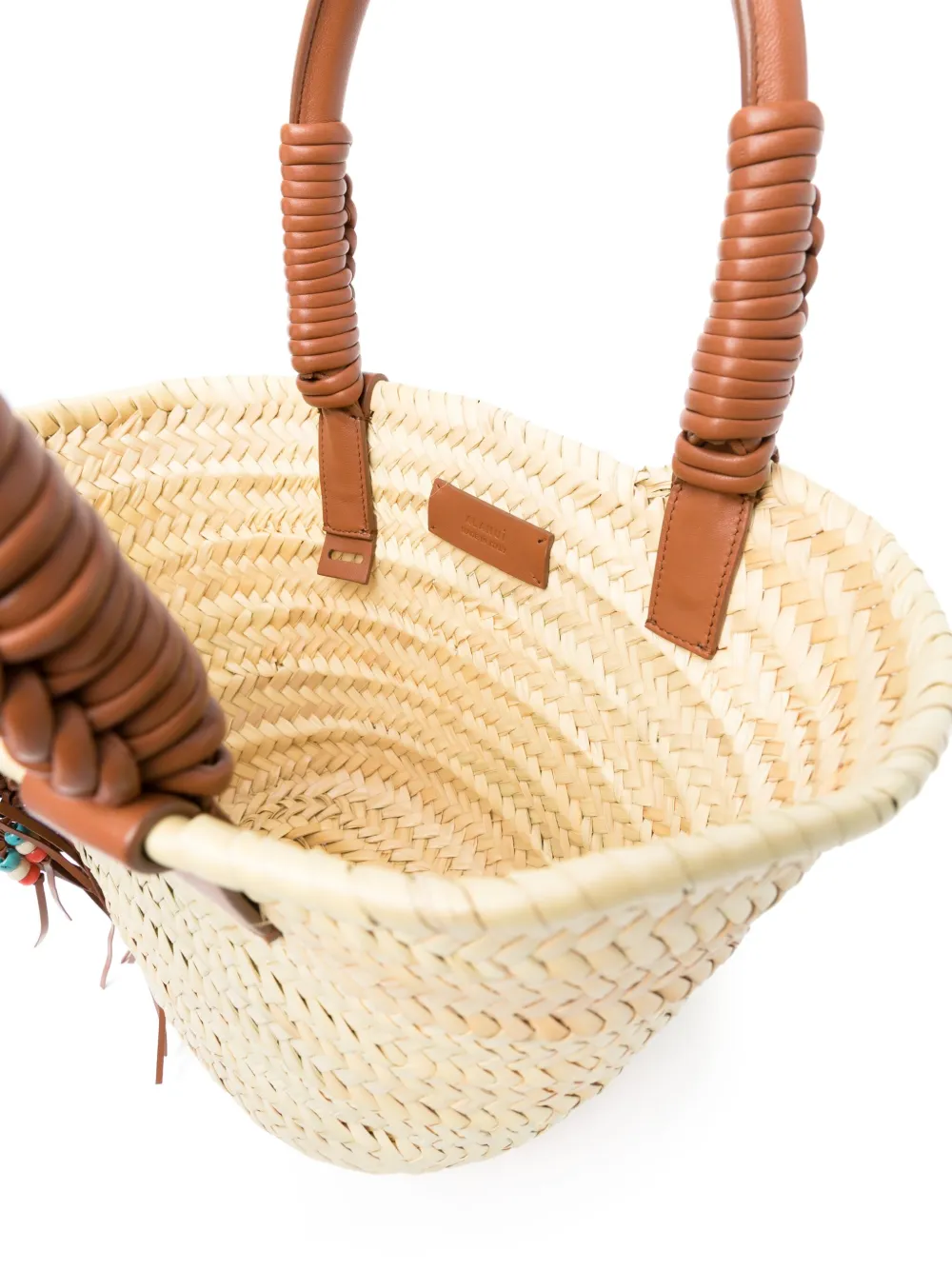 Подробнее о товаре: • светло-бежевый/темно-коричневый • рафия/овечья кожа • переплетенный дизайн • кожаная бирка с монограммой • большая подвеска-кисточка с бусинами • плетеная отделка • дизайн с открытым верхом • две закругленные верхние ручки • плоское основание • модель без подкладки • внутренняя вставка с логотипом • основное отделение • съемный карман-мешочек • В комплект входит мешок-пыльник для хранения.