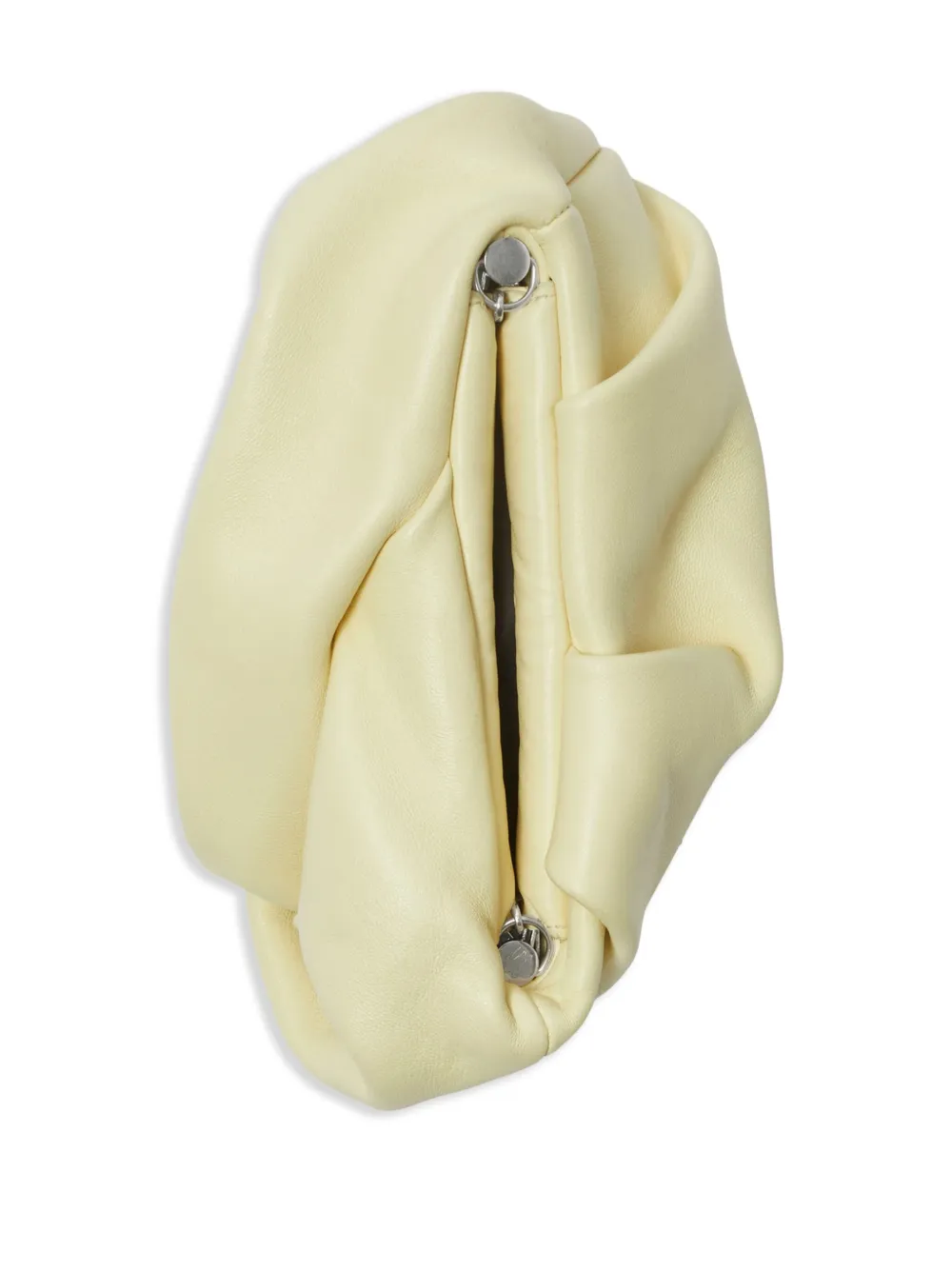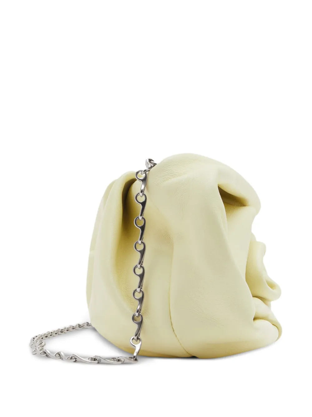 Бледно-желтый, овечья кожа, зернистая текстура, детали с оборками, объемная аппликация, роза, серебристая фурнитура, булавочная застежка, ремешок-цепочка на плечо и цельная подкладка.