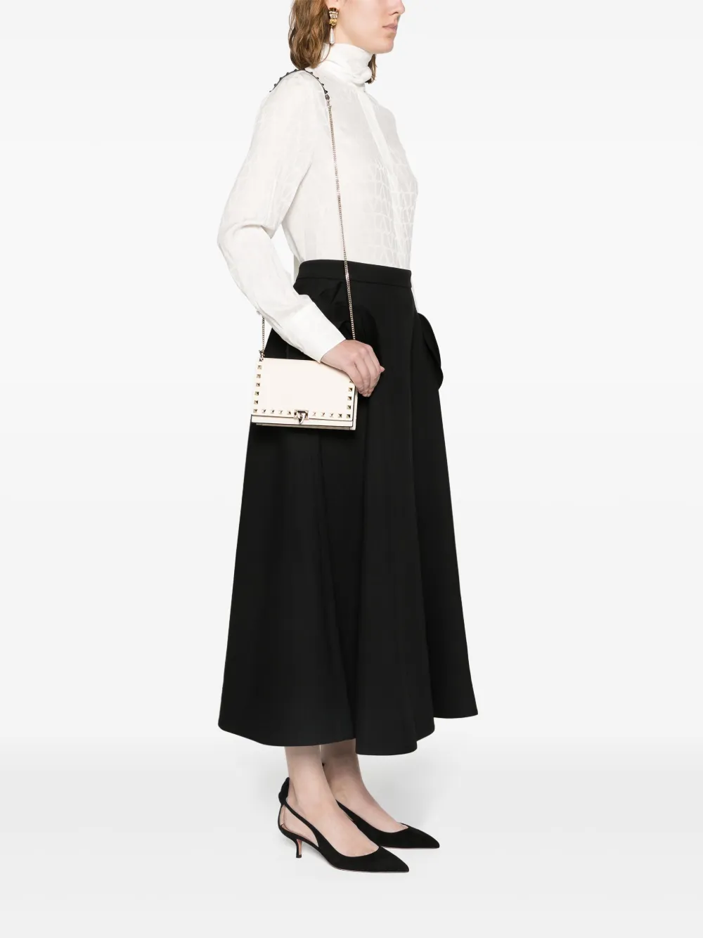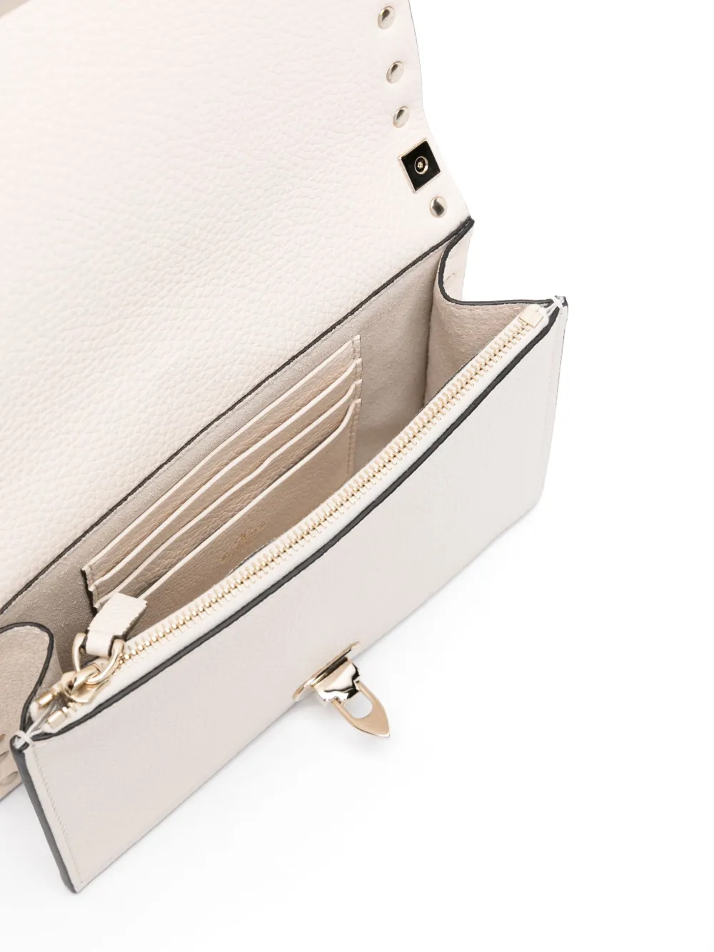 Подробнее о товаре: • кремовый • телячья кожа • зернистая текстура • заклепки Rockstud • тисненый логотип сзади • откидной верх • застежка с поворачивающимся замком • съемный ремень из кожи и металла • замшевая подкладка • тисненый логотип внутри • внутренние отделения для карт • внутренний карман на молнии • основное отделение • золотистая фурнитура • В комплект входит мешок-пыльник для хранения. • К этому товару прилагается сертификат подлинности.
