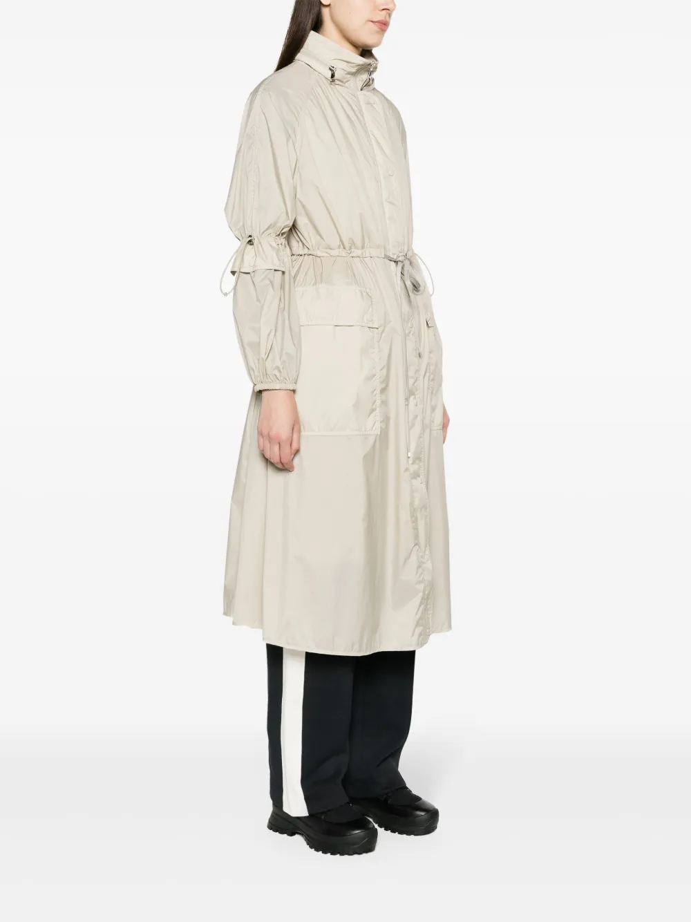 Подробнее о товаре: • светло-бежевый • наполнитель из смеси пуха и пера • нашивка с логотипом на рукаве • воротник-стойка • потайной капюшон • застежка на кнопках спереди • двусторонняя молния спереди • пуллер с логотипом • длинные рукава реглан • рукава с кулиской • эластичные манжеты • кулиска на талии • два накладных кармана спереди • закругленный подол • длина до середины голени • стеганая подкладка