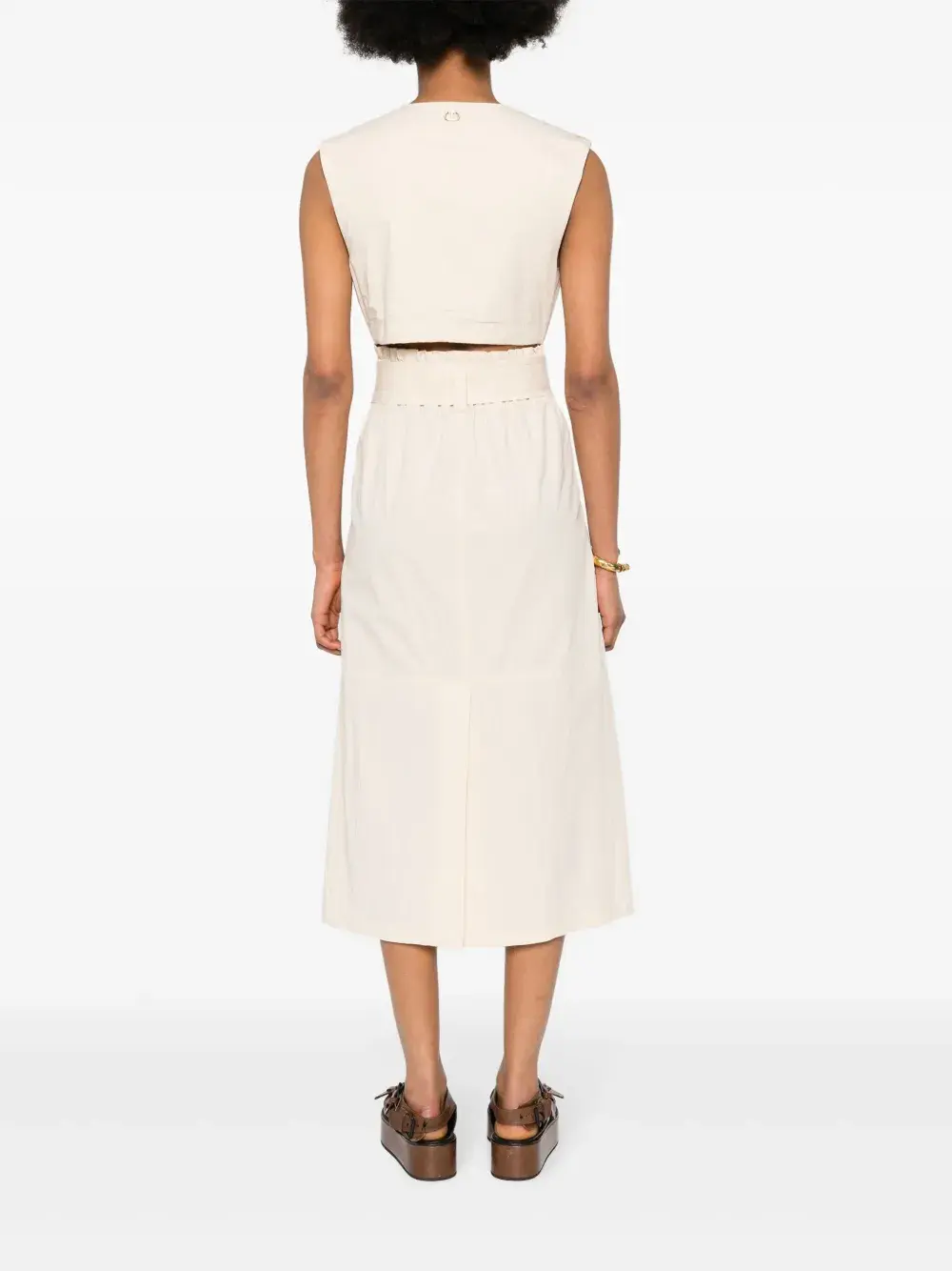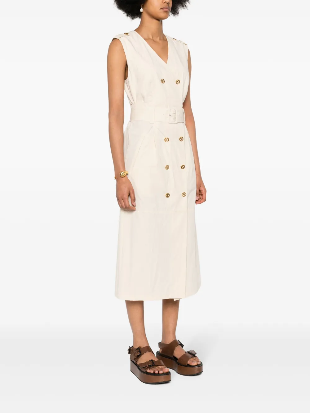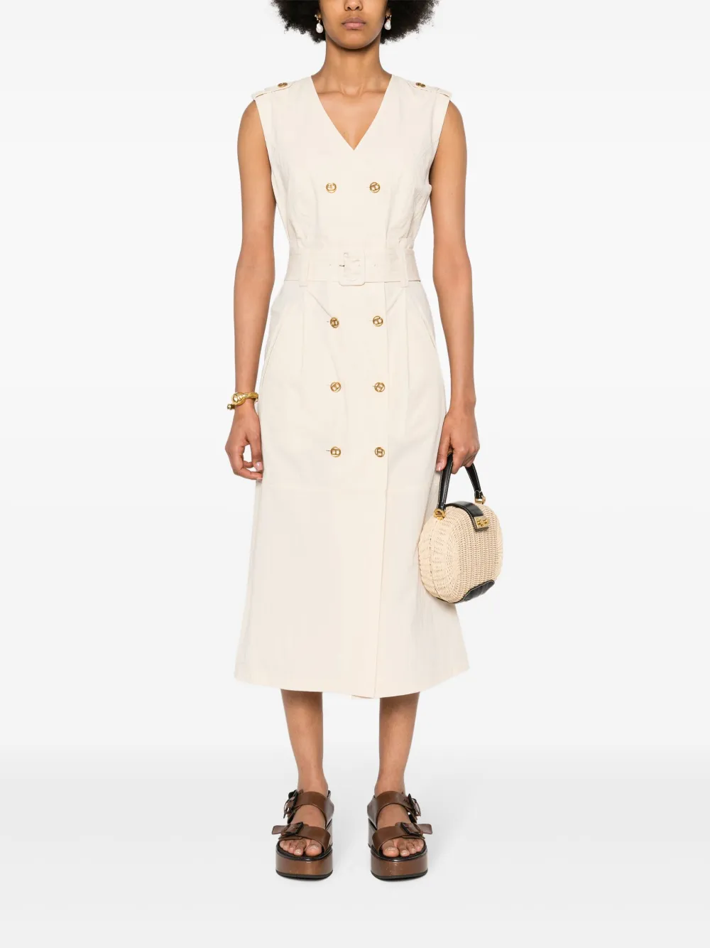 Подробнее о товаре: • расцветка Blush Beige • хлопок • поплин • тональная строчка • эполеты • золотистые пуговицы с выгравированным логотипом • V-образный вырез • без рукавов • многослойные вставки на талии • петли для ремня • съемный пояс • два прорезных кармана спереди • длина до середины голени • прямой подол • золотистый металлический логотип сзади • вырезные детали сзади • эластичный пояс сзади • шлица по центру сзади • двубортная застежка на пуговицы