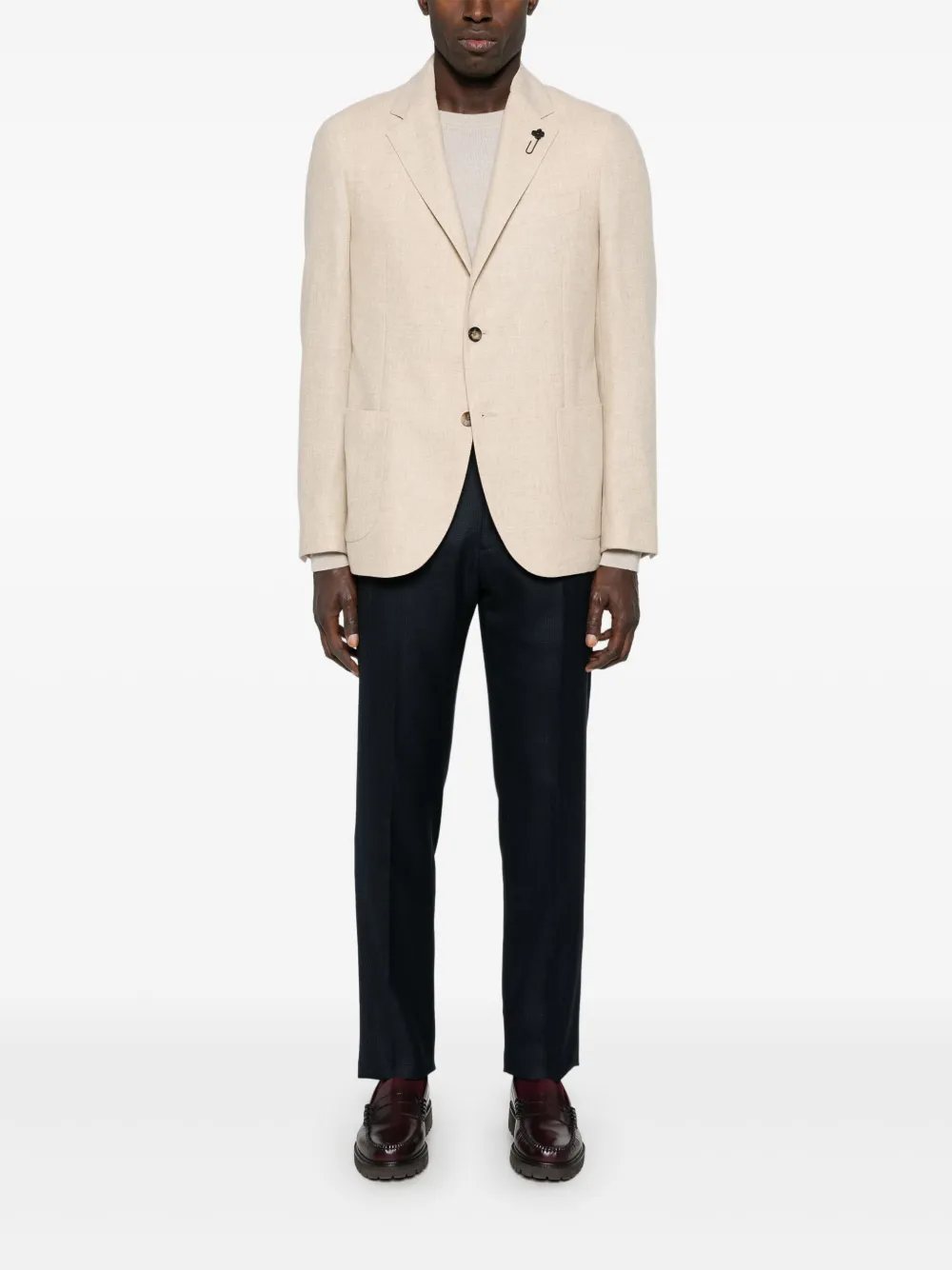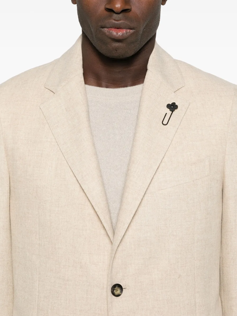 Подробнее о товаре: • светло-бежевый • смесь вирджинской шерсти и кашемира • эффект меланж • застежка на пуговицах спереди • зазубренные лацканы • съемная брошь с логотипом • длинные рукава с манжетами на пуговицах • прорезной карман на груди • защипы • два накладных кармана по бокам • две боковые шлицы сзади • два внутренних накладных кармана • частичная подкладка • прямой подол
