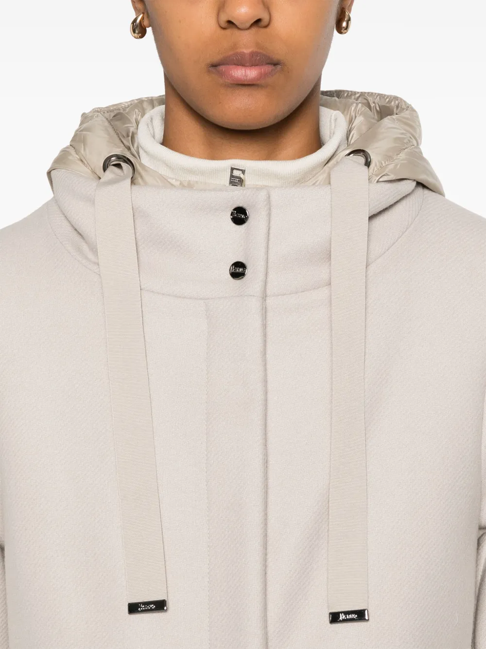 Подробнее о товаре: • бежевый • смесовая вирджинская шерсть • наполнитель из смеси пуха и пера • А-образный силуэт • легкая конструкция • многослойный дизайн • застежка на кнопки и молнию спереди • объемный капюшон на шнурке • высокий воротник • длинные рукава • стеганая вставка • два вшитых кармана по бокам • стеганая вставка • цельная подкладка • прямой подол • длина выше колена