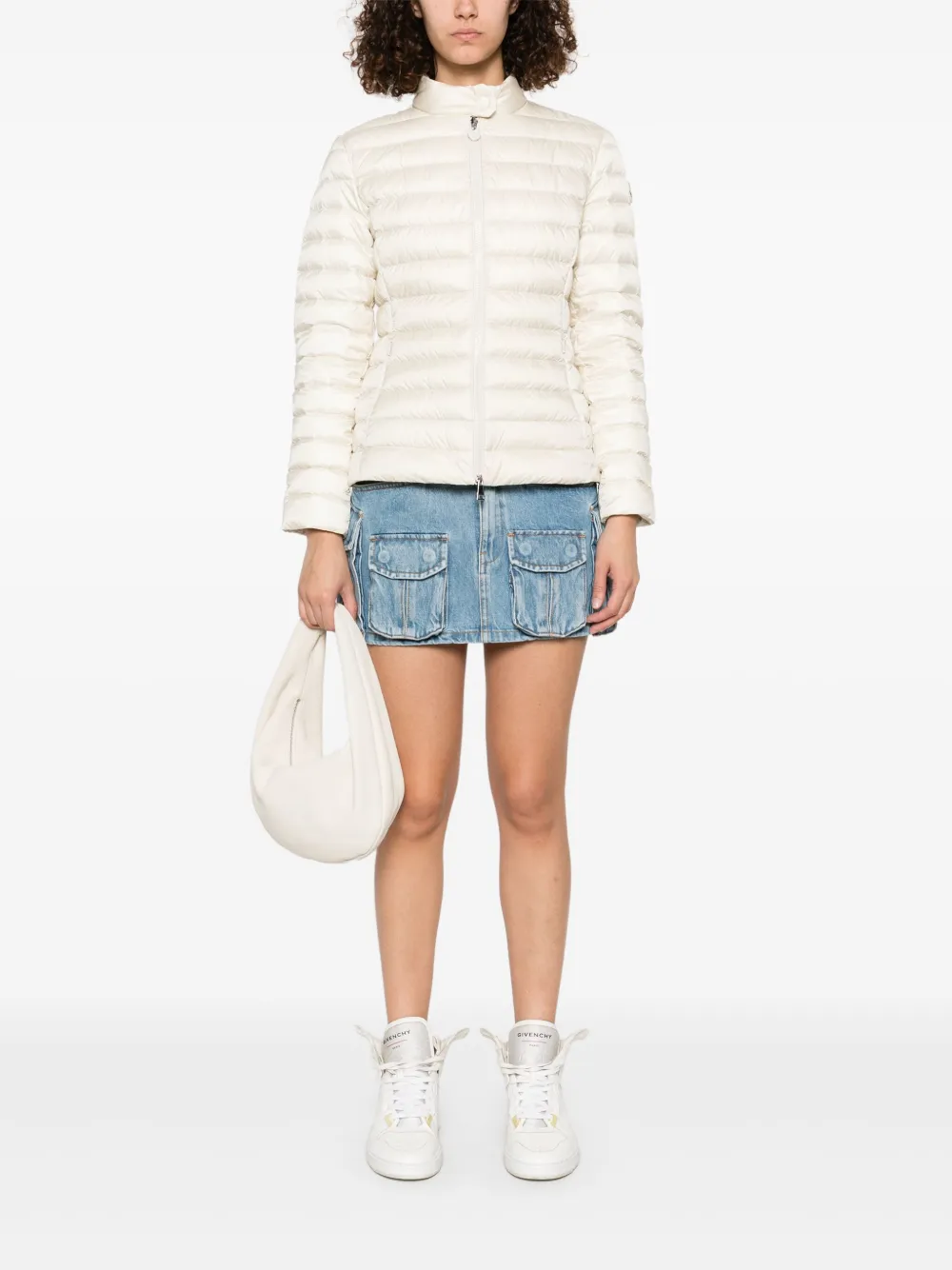 Светло-бежевая застежка-молния с двумя бегунками спереди, стеганые карманы по бокам на молнии, воротник на кнопках