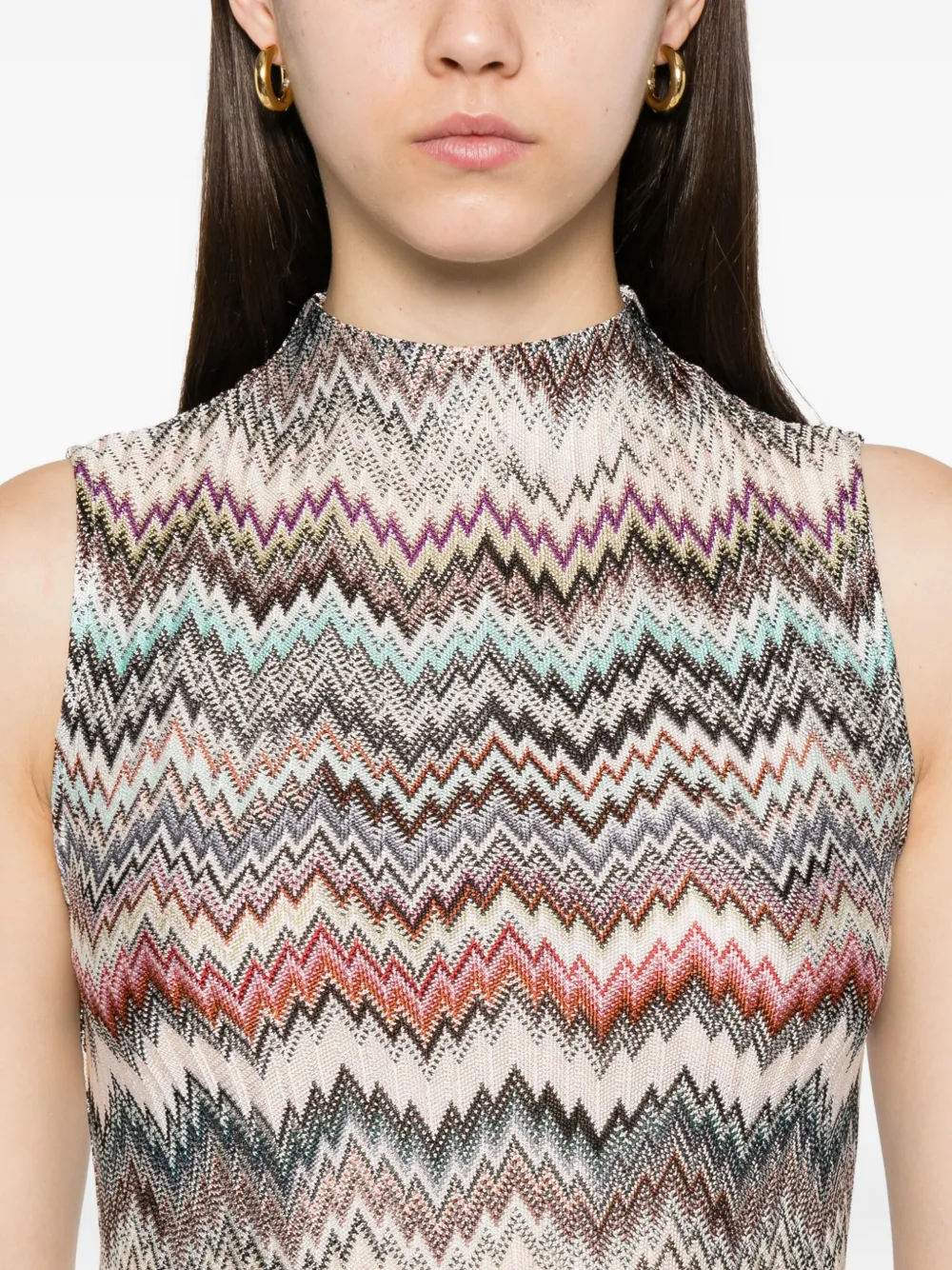 Бежевый топ без рукавов с воротником-стойкой, прямой подол. Полученный вами товар может немного отличаться от представленного на фотографии. Это связано с тем, что все изделия Missoni изготавливаются вручную.