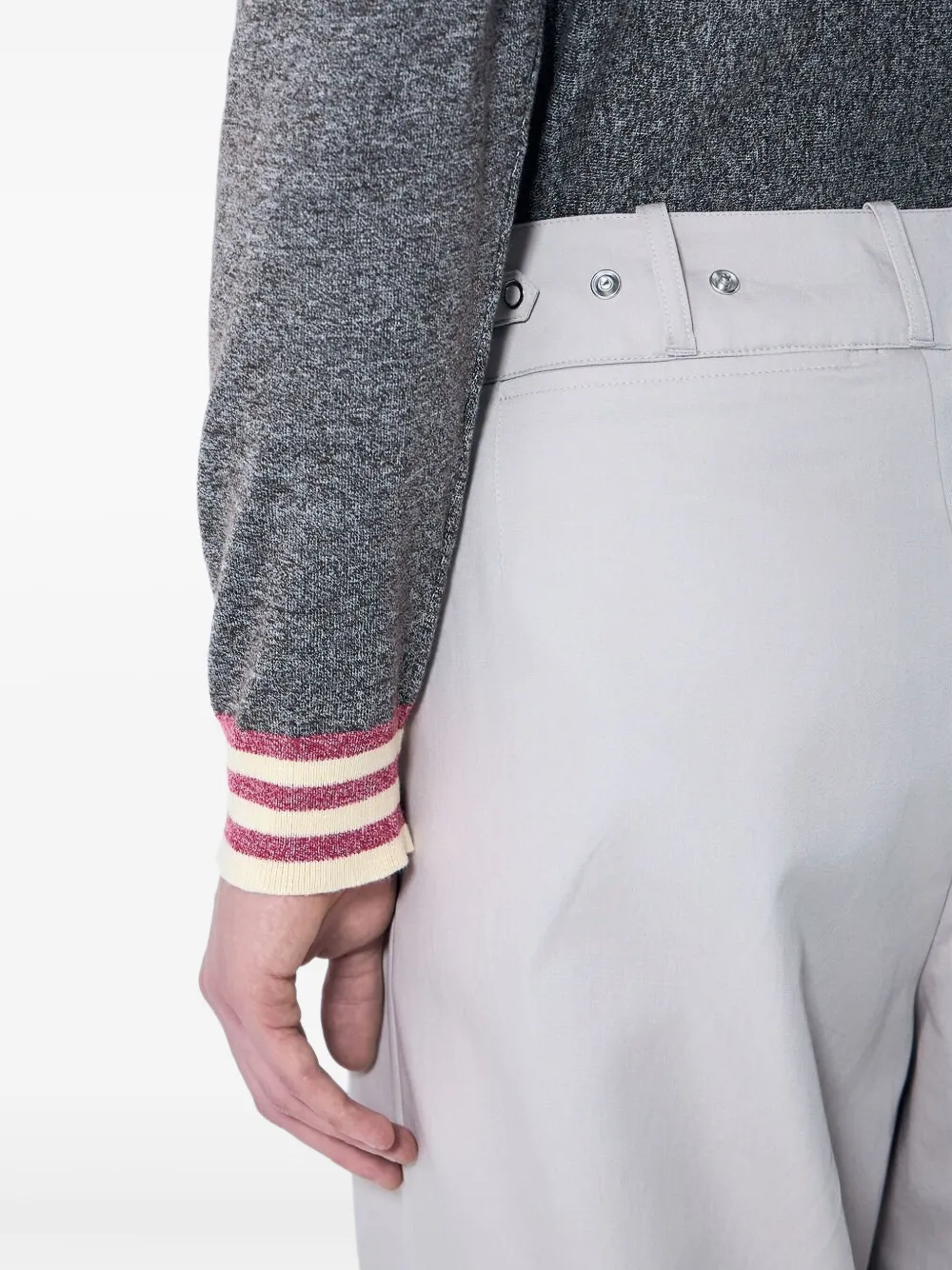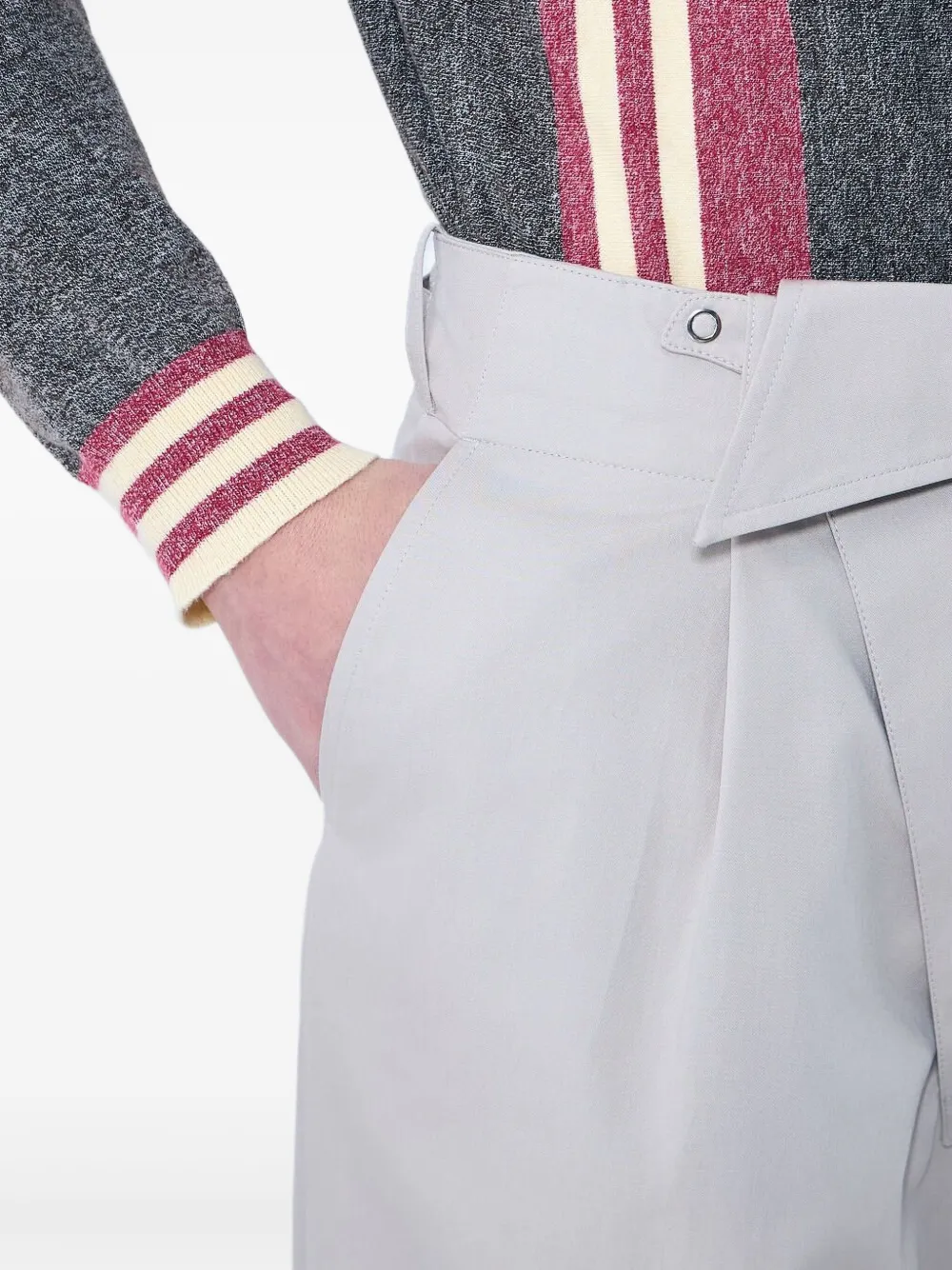 Светло-серая застежка на кнопку и молнию спереди, два боковых кармана, сложенный край, отделка складками
