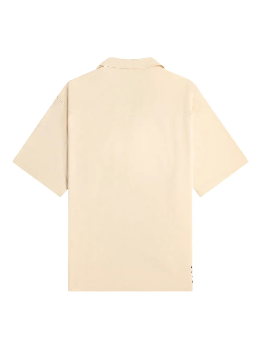 Песочно-бежевый цвет, застежка на пуговицы спереди, нагрудный накладной карман, зазубренные лацканы, короткие рукава