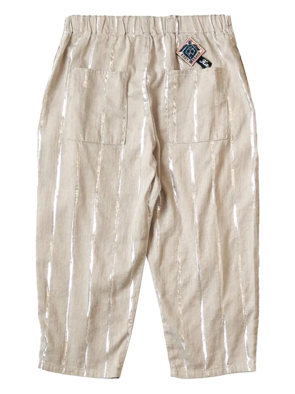 Узор в вертикальную полоску цвета экрю, эластичный пояс, контрастная отделка, два боковых кармана, нашивка с логотипом сзади, два накладных кармана сзади