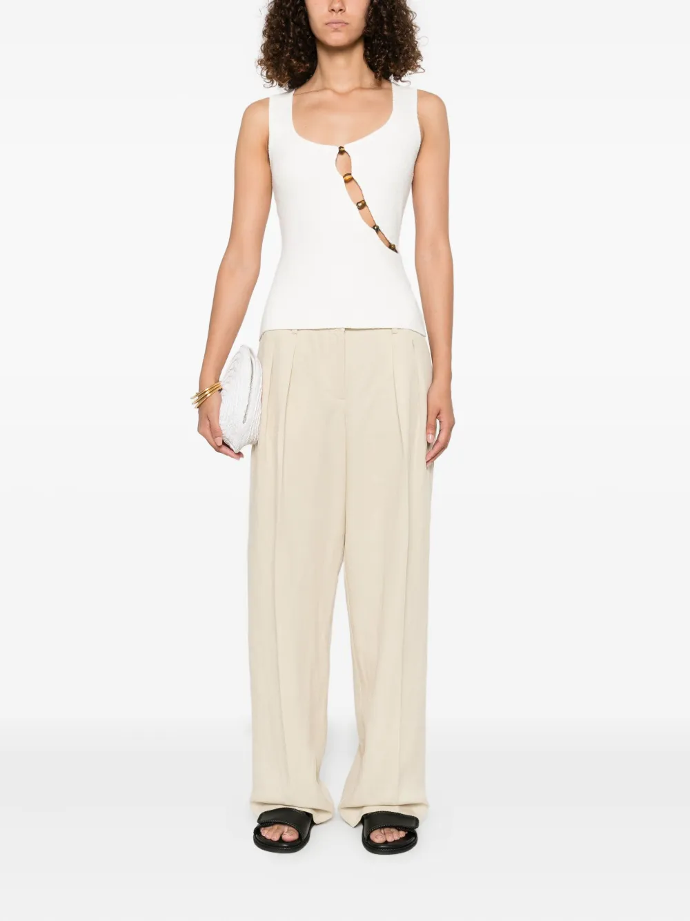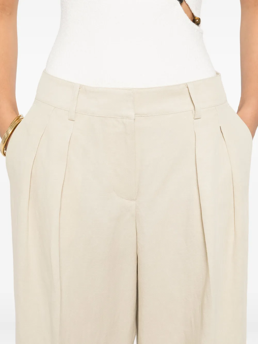 Светло-бежевые шлевки для ремня, складки, два боковых прорезных кармана, задний прорезной карман