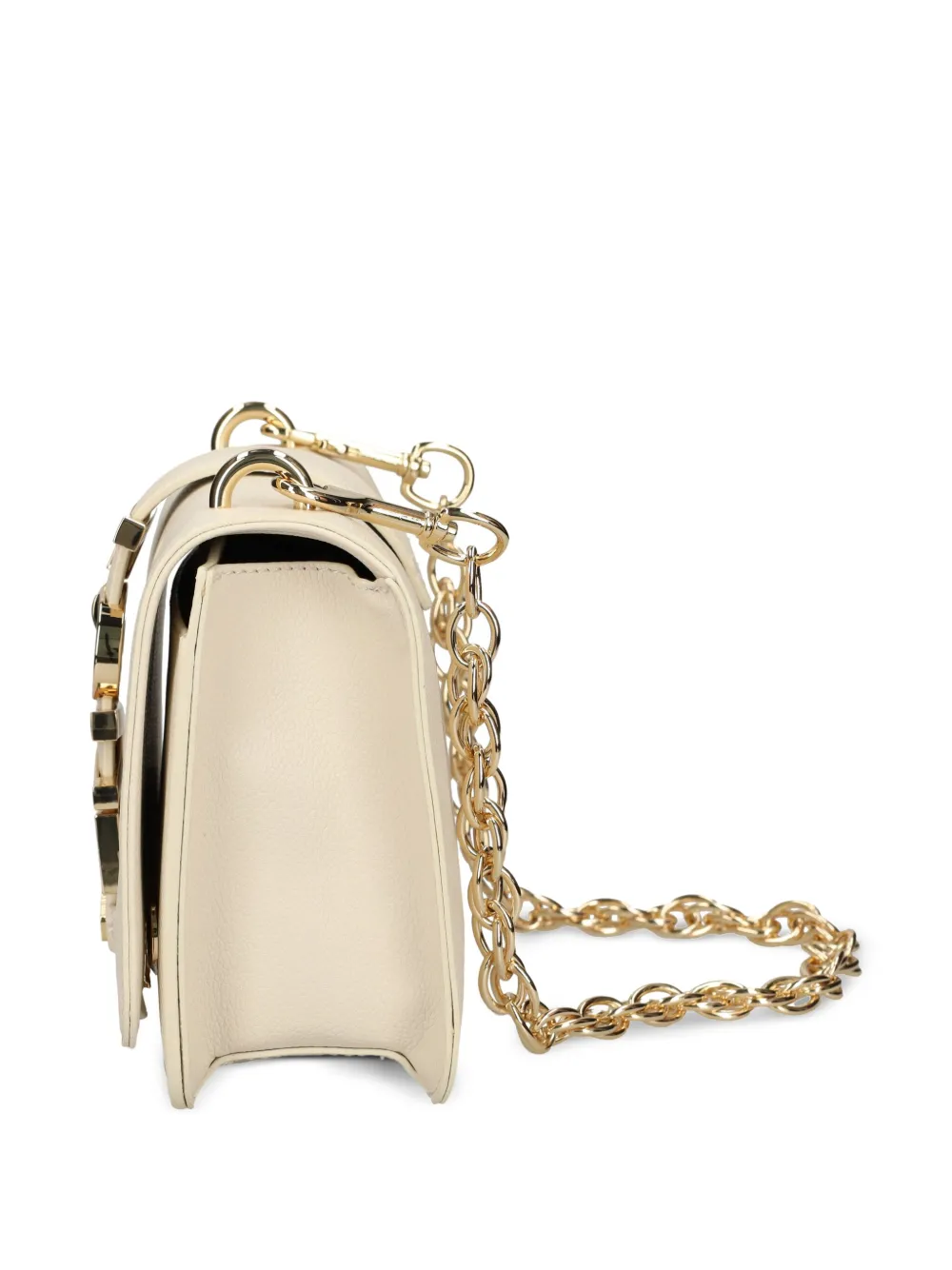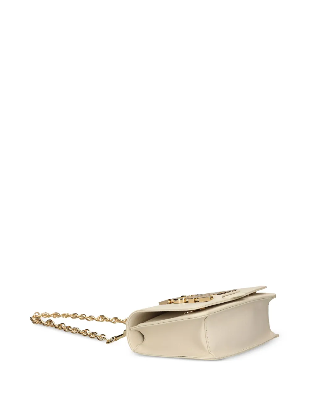 Светло-бежевый откидной верх с магнитной застежкой, съемный плечевой ремень-цепочка, основное отделение, накладной карман спереди