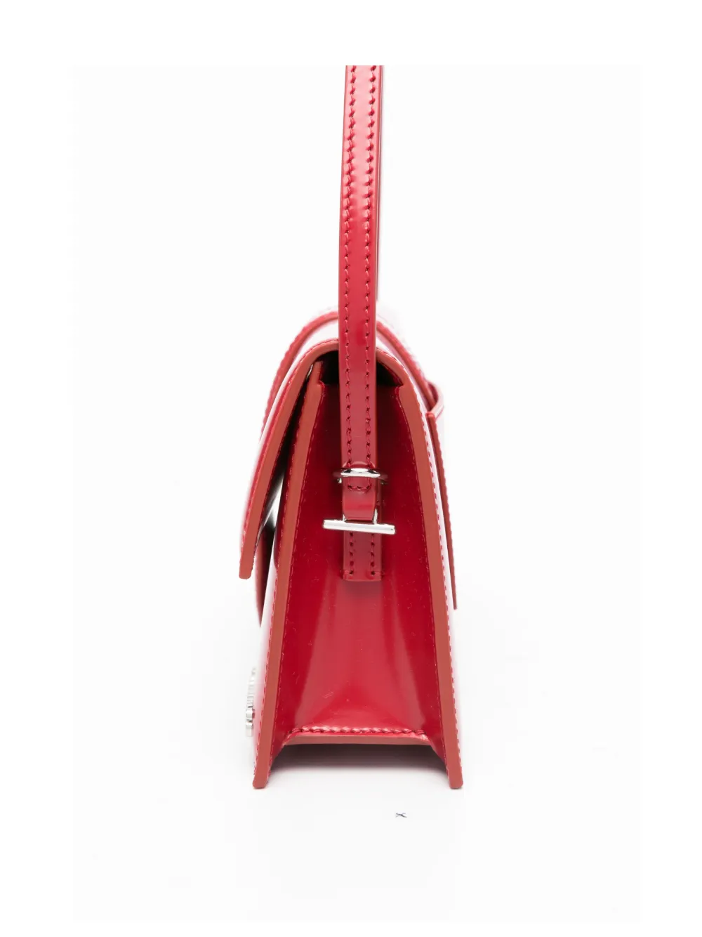 Ярко-красный откидной клапан с магнитной застежкой, один плечевой ремень, надпись логотипа. В комплекте с сумкой поставляется защитный пылезащитный мешок. Сделано в Италии.