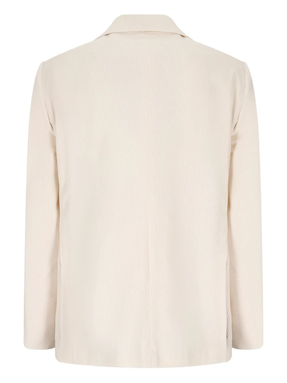 Вельветовая текстура кремового цвета, застежка на три пуговицы, накладные карманы, отложной воротник, прямой подол