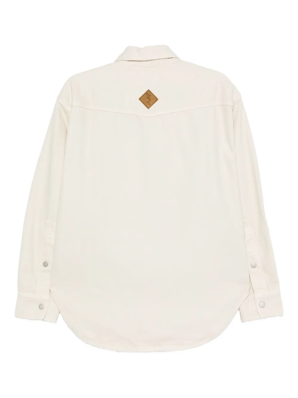 Застежка на пуговицы цвета экрю, закругленный край, кожаная нашивка