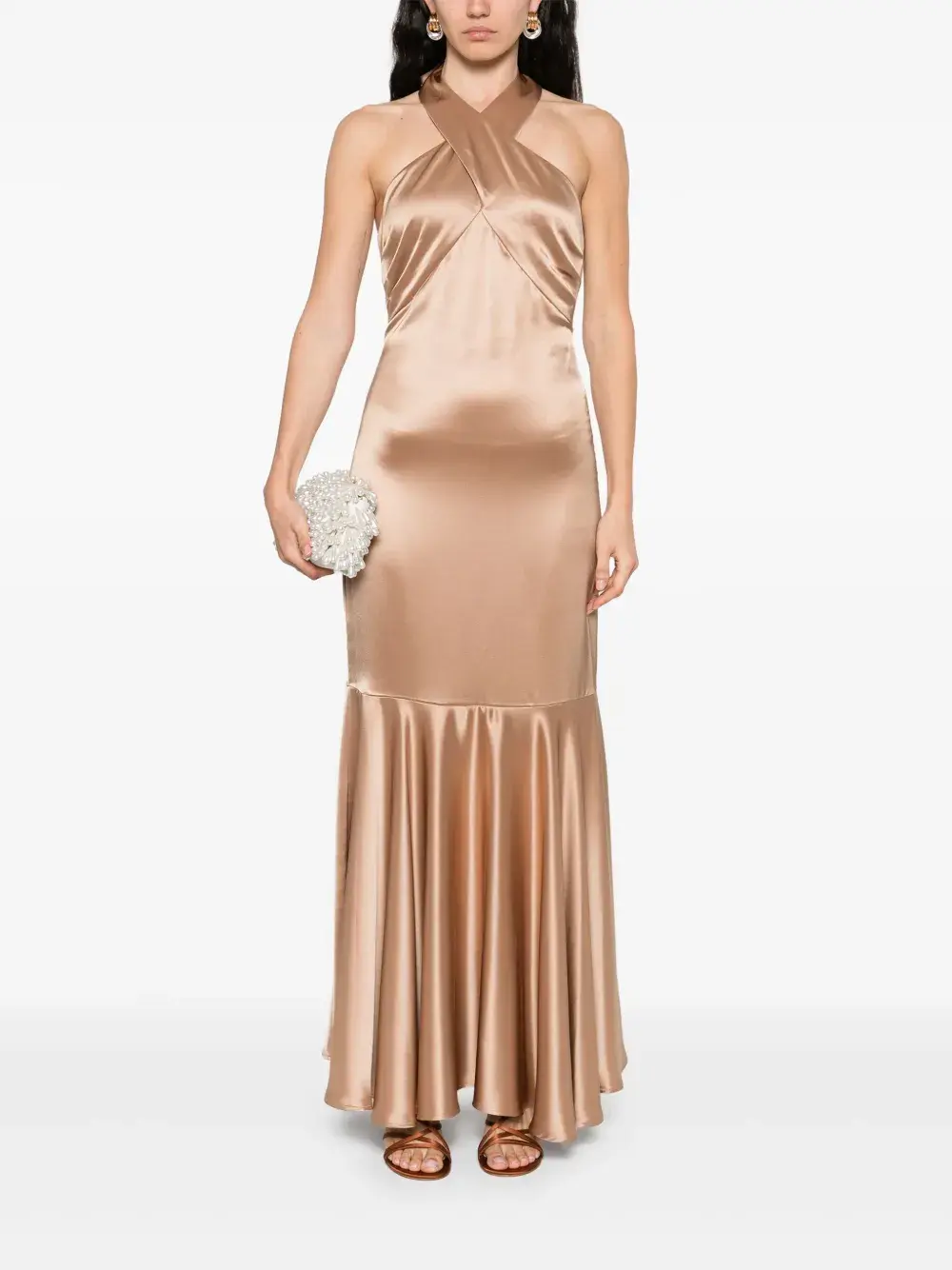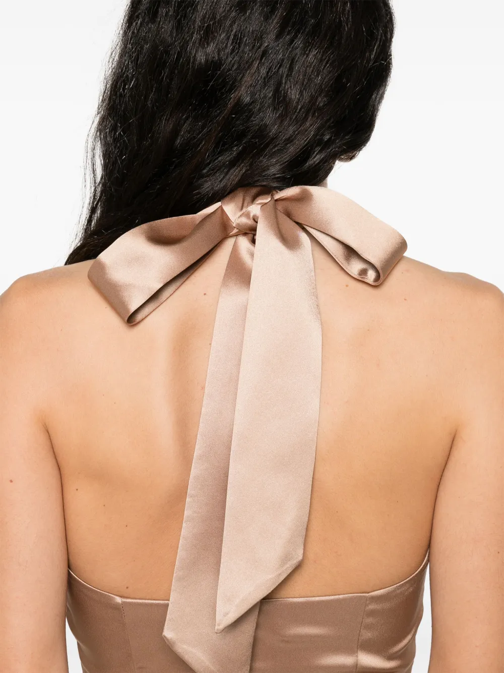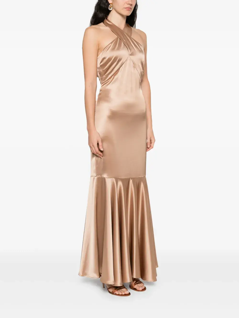 Миндально-бежевого цвета, потайная застежка-молния сзади, завязка на шее, без рукавов, силуэт «русалка»