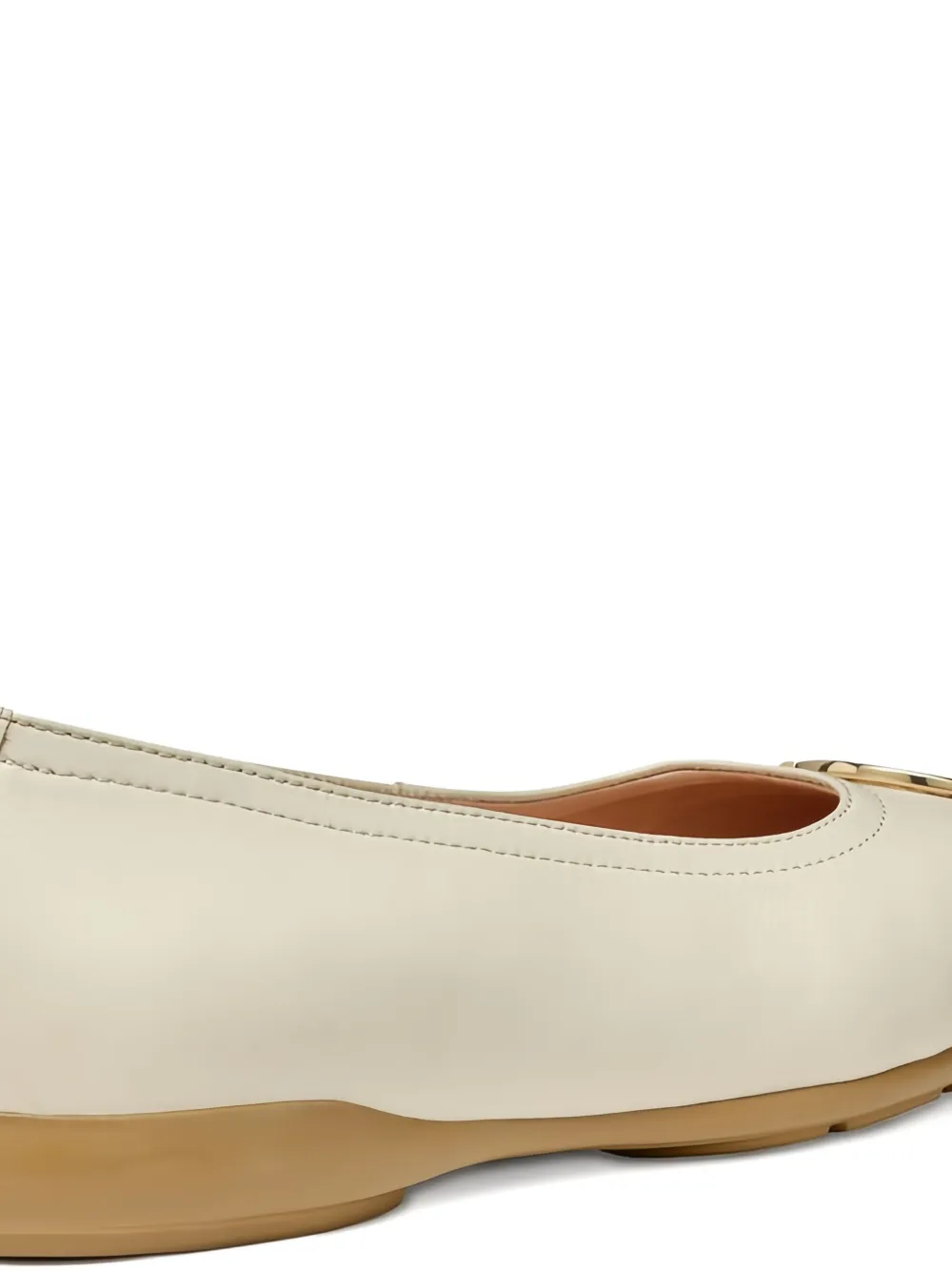 Бежевая кожа, золотистая пряжка, круглый носок, низкий каблук, резиновая подошва