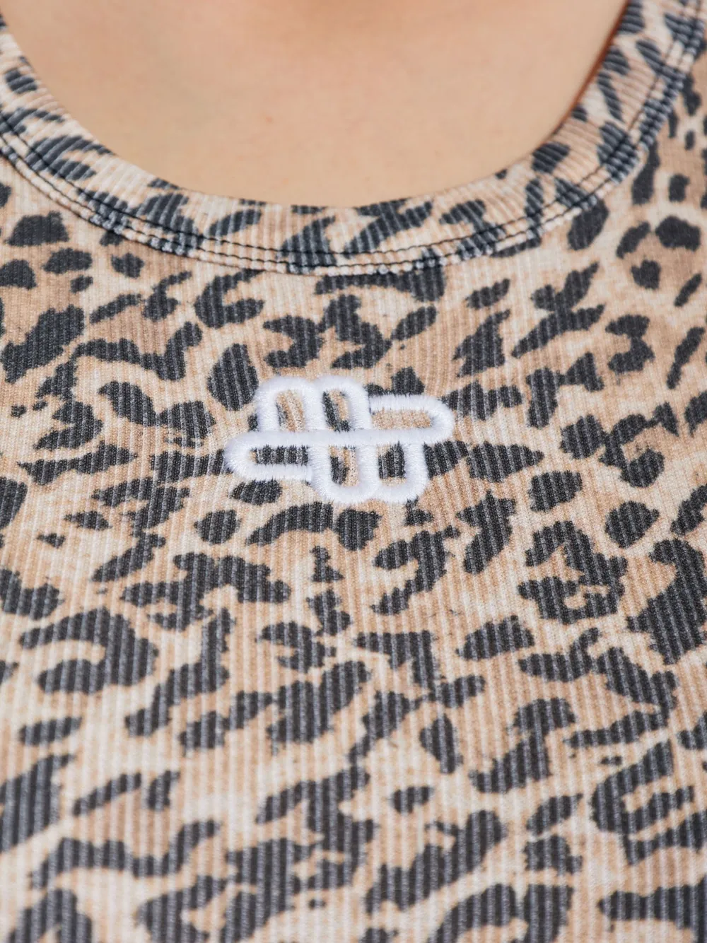 Бежевый леопардовый принт по всей поверхности, круглый вырез, спина-борцовка, облегающий крой