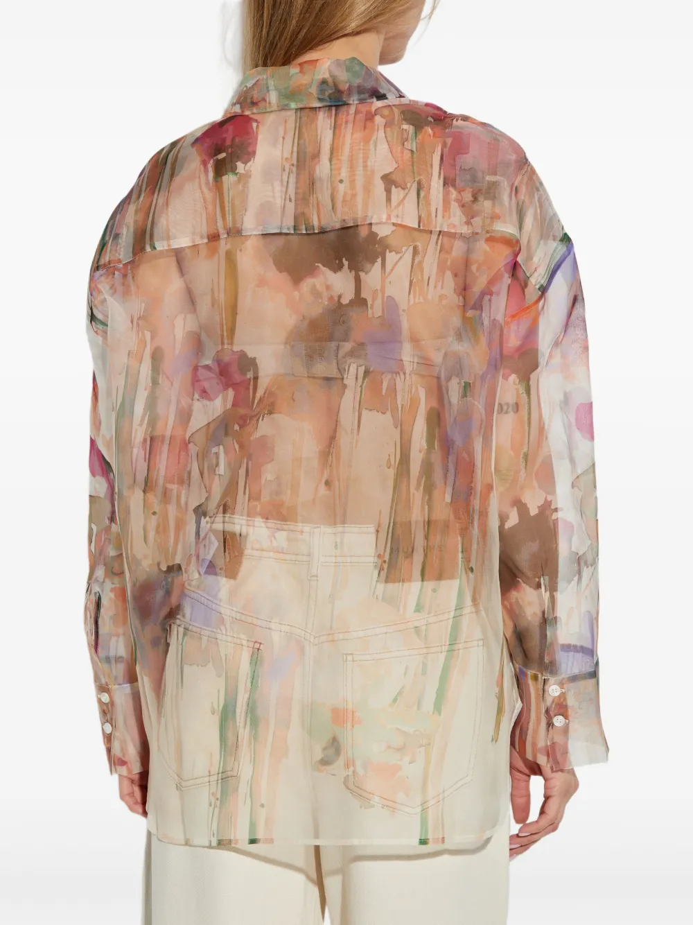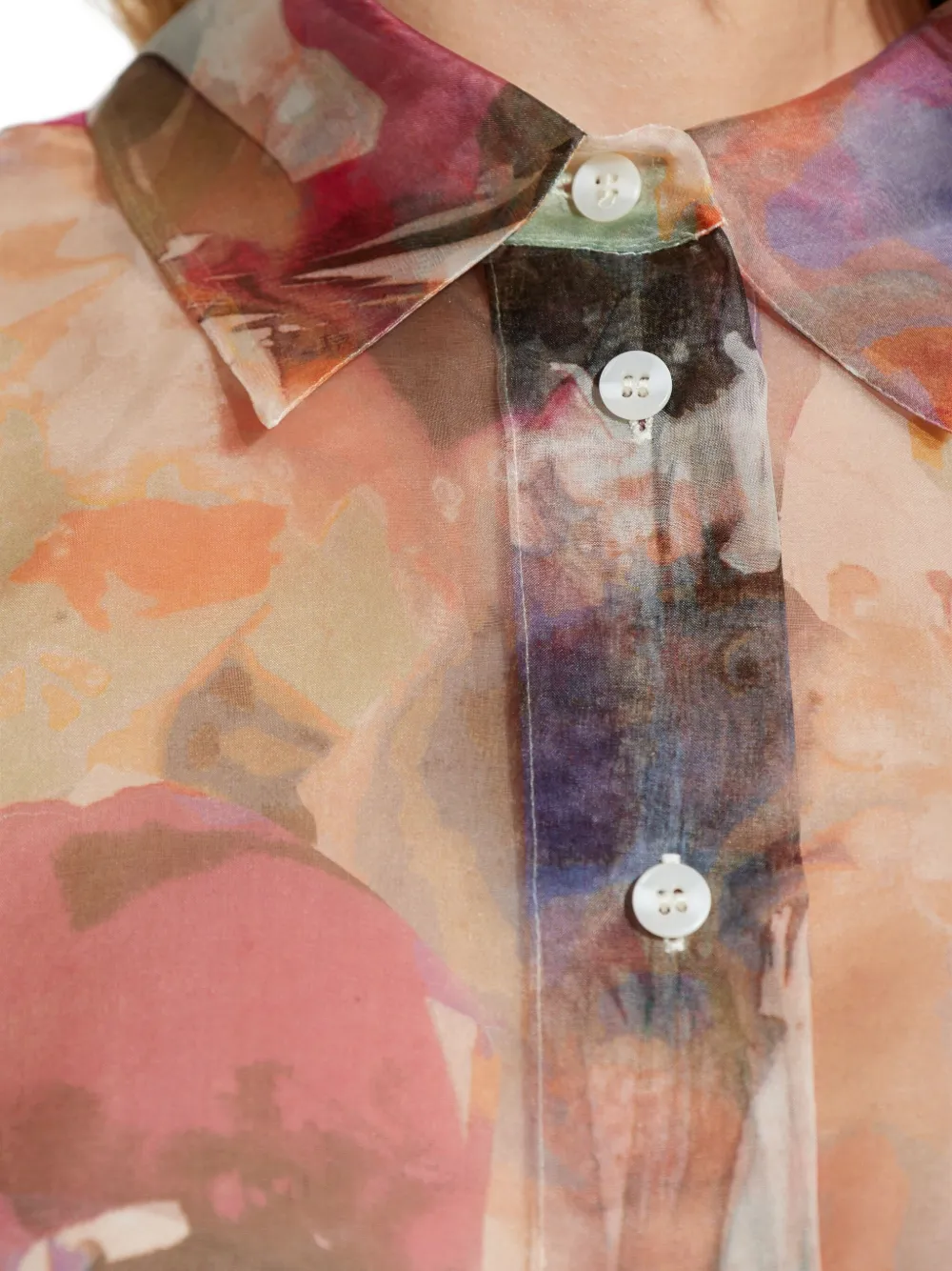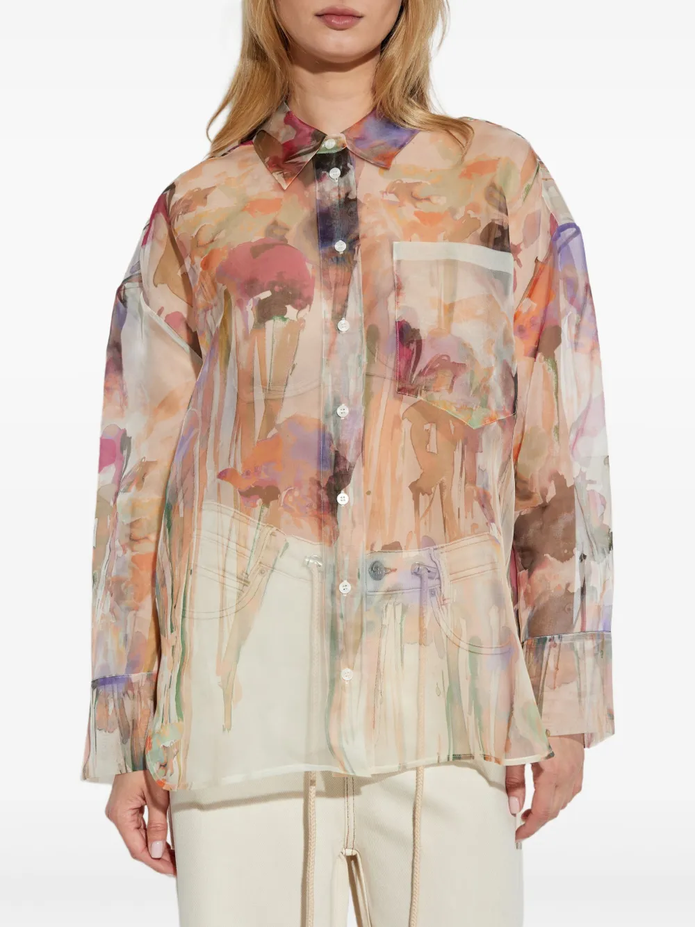 Разноцветные пуговицы спереди, длинные рукава, полупрозрачная грудь, накладной карман, застегивающиеся на пуговицы манжеты, закругленный подол