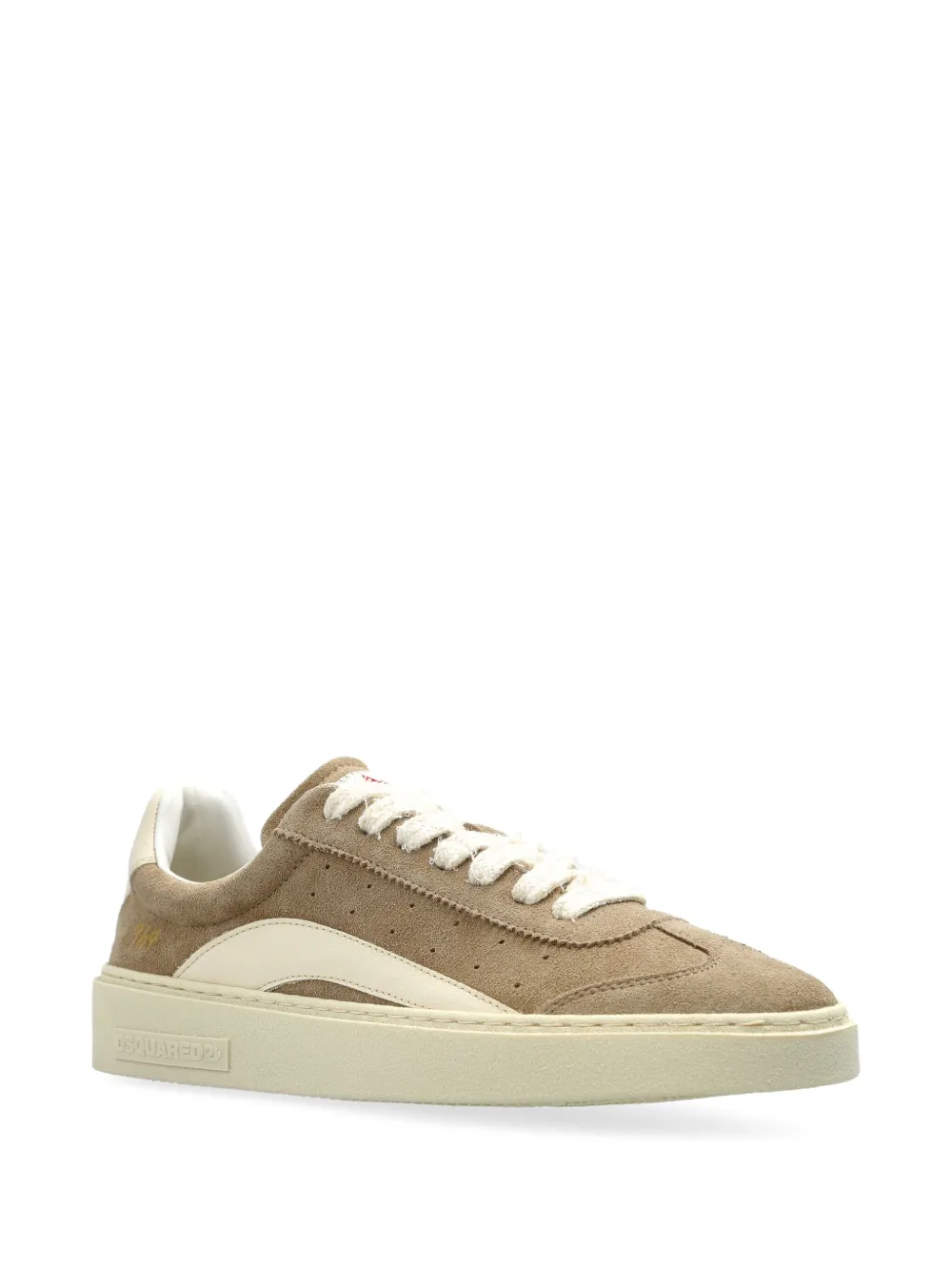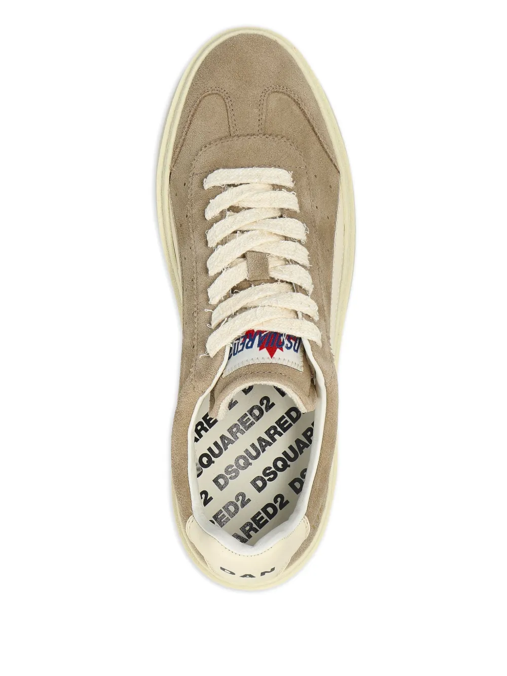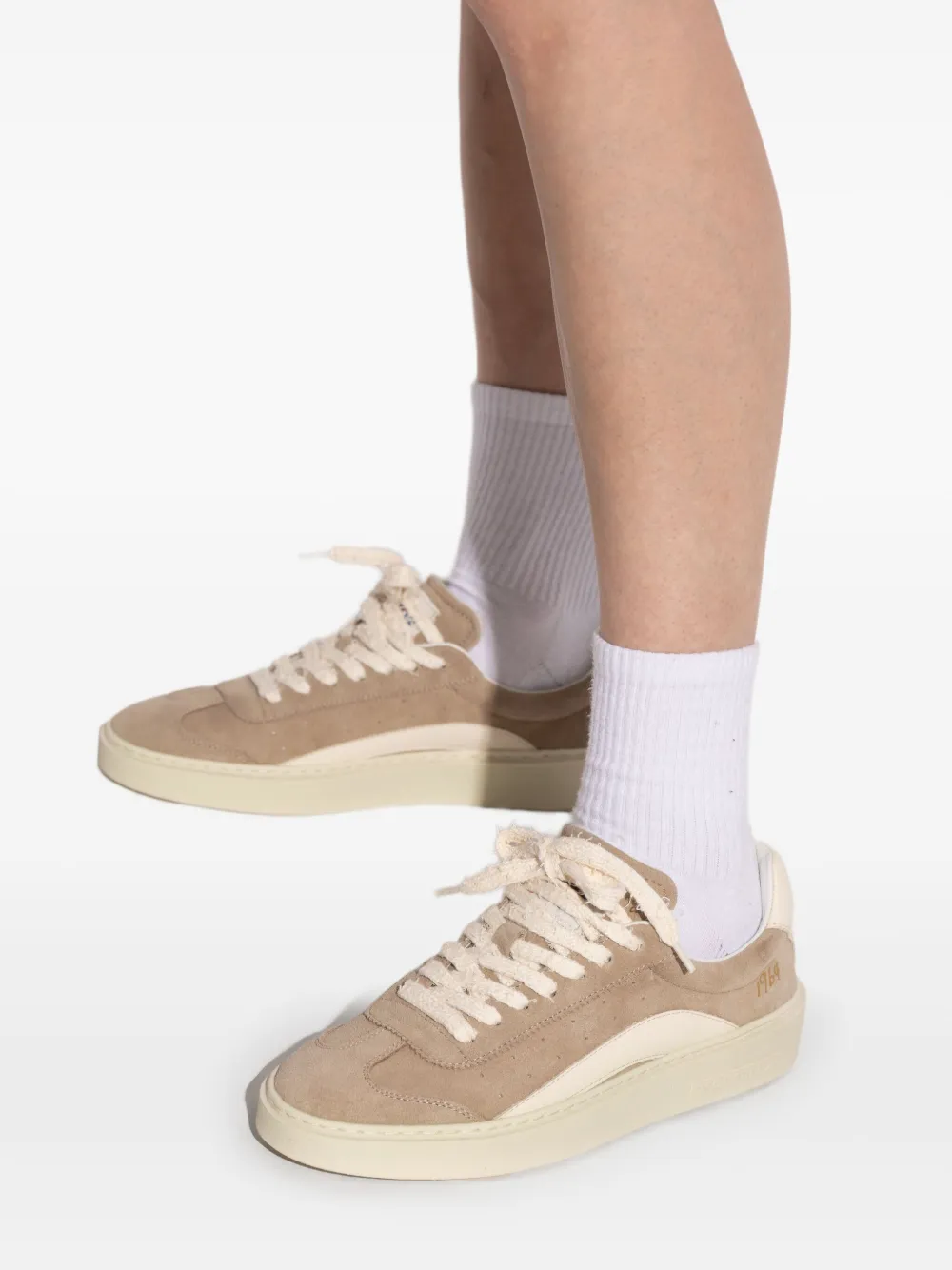 Бежевая шнуровка, фирменная стелька, круглый носок, нашивка с логотипом на язычке, перфорированные детали