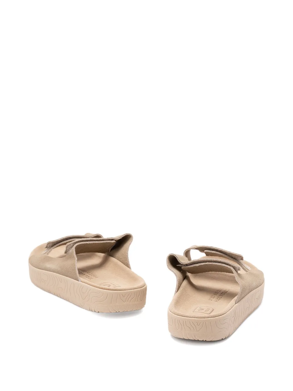 Бежевый, с застежкой на два ремешка, массивная платформа, текстурированная межподошва, тисненый логотип
