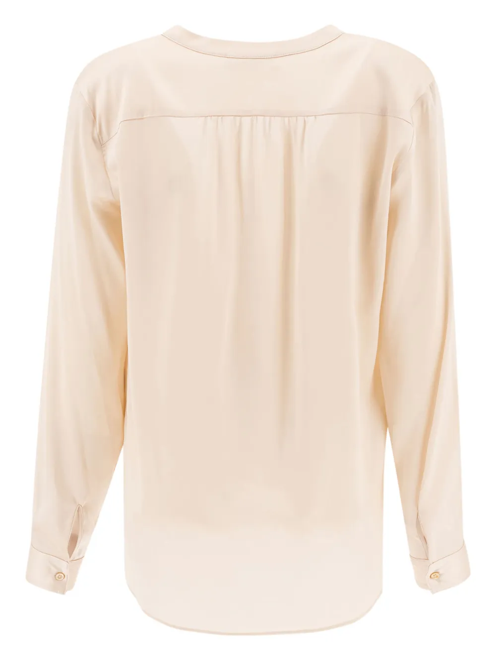 Бежевый, V-образный вырез, длинные рукава, пуговицы на манжетах, боковые разрезы