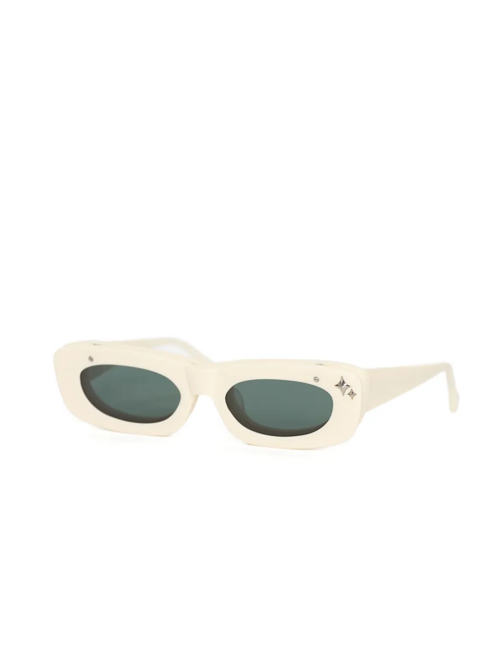 Прямоугольная оправа из светло-бежевого ацетата, тонированные линзы, декор в виде звезд, гладкая отделка. Очки поставляются с защитным футляром.