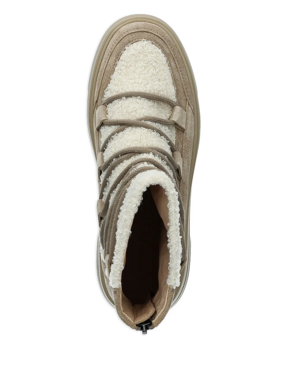 Верх из бежевой замши, шнуровка, фактурная подошва, флисовая отделка, платформа