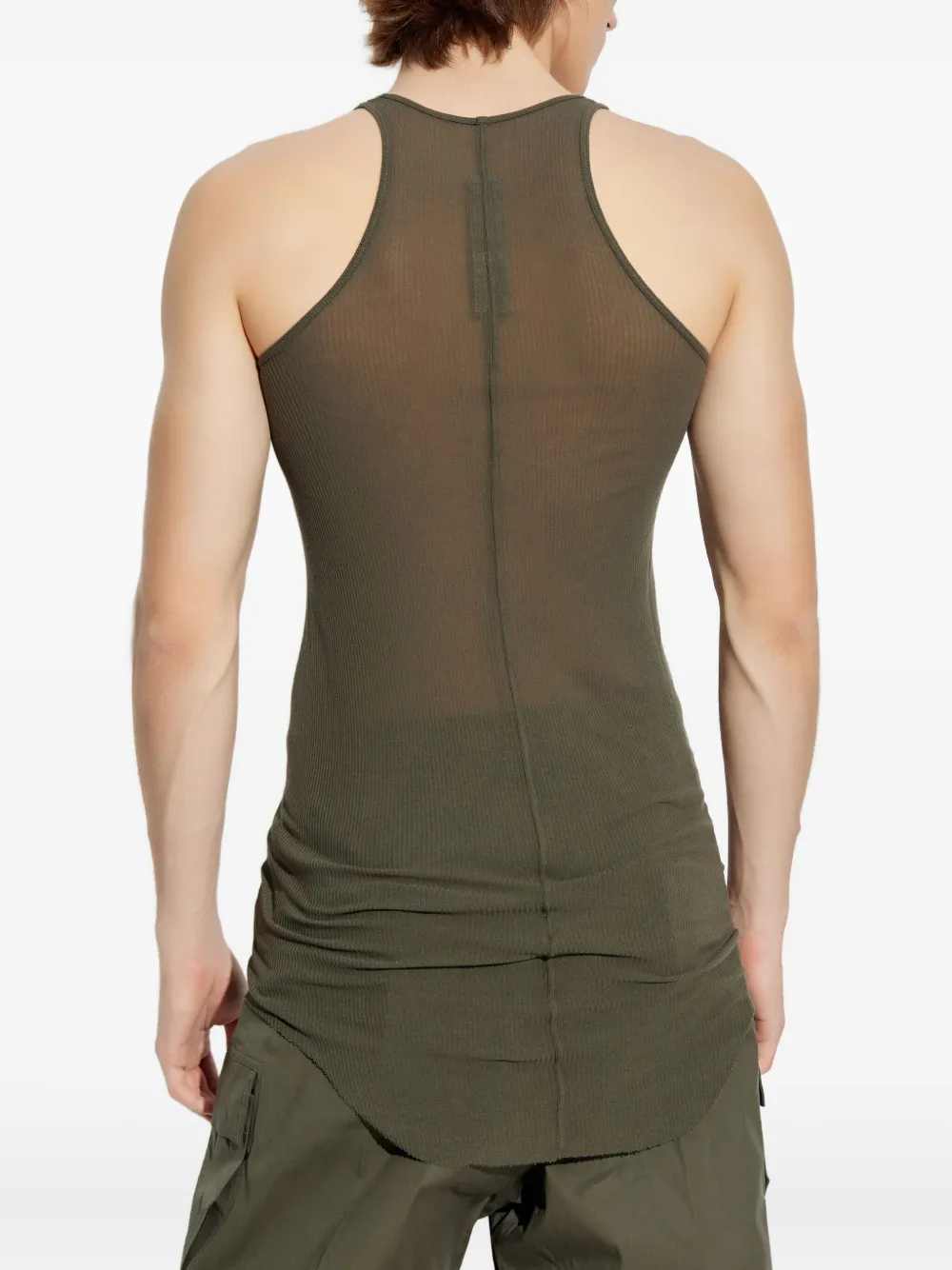 Оливково-зеленая ребристая фактура, дизайн спинки-борцовки, закругленный подол, без рукавов