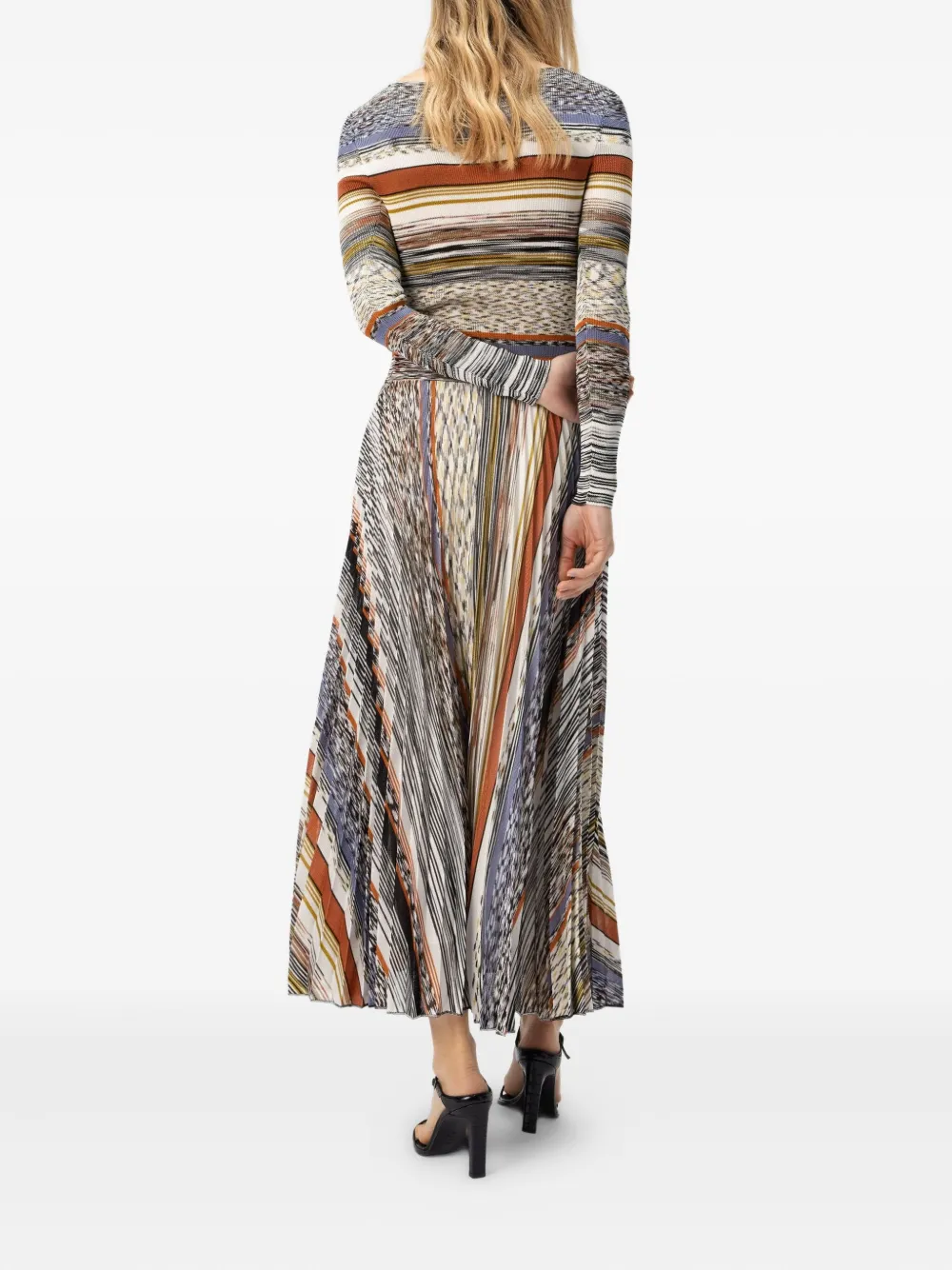 Бежевая юбка А-силуэта в полоску, длинные рукава, округлый вырез горловины. Полученный вами товар может немного отличаться от представленного на фотографии. Это связано с тем, что все изделия Missoni изготавливаются вручную.