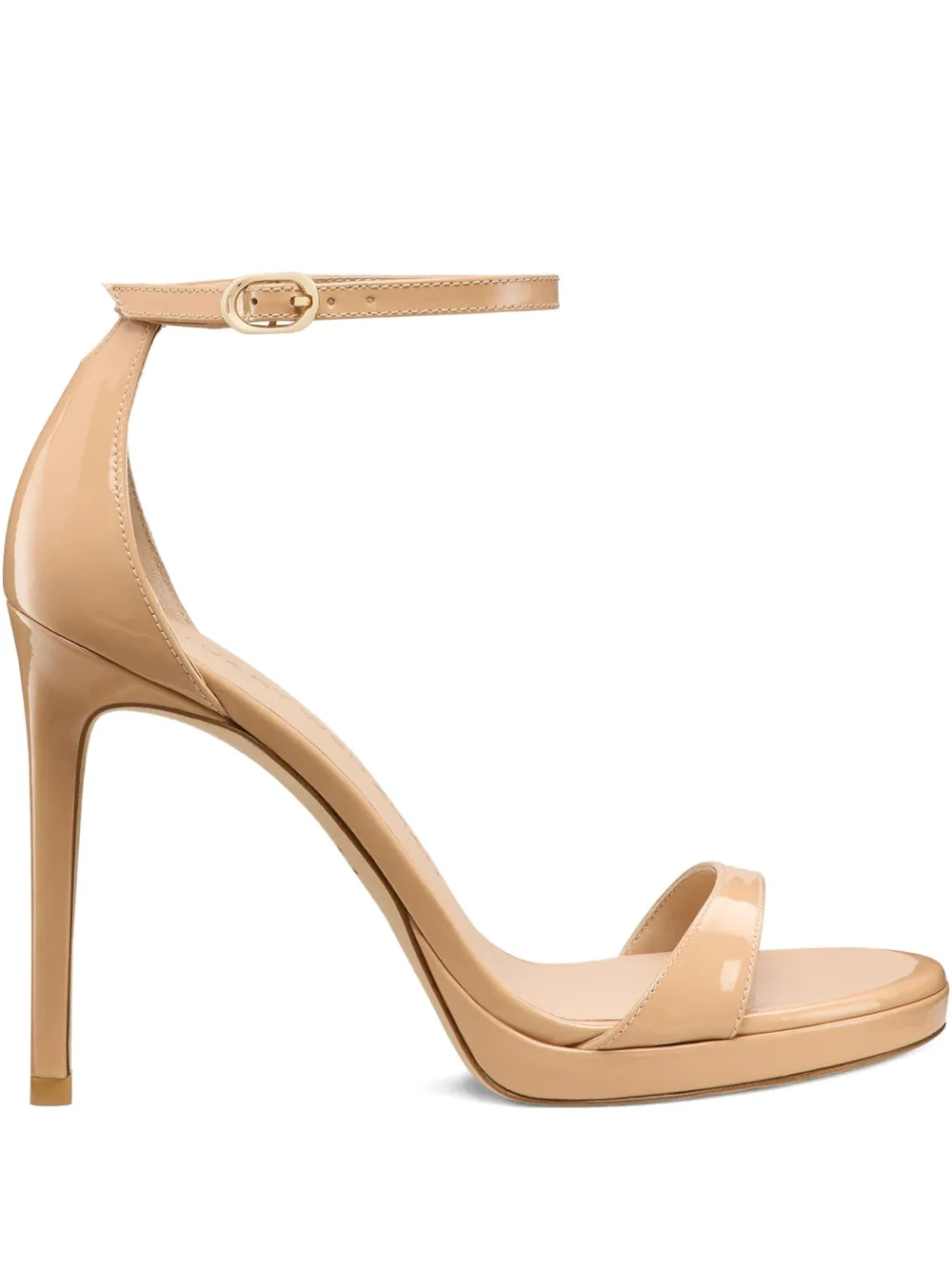 Бежевый лакированный каблук-шпилька с ремешком на щиколотке и застежкой на пряжке, платформа