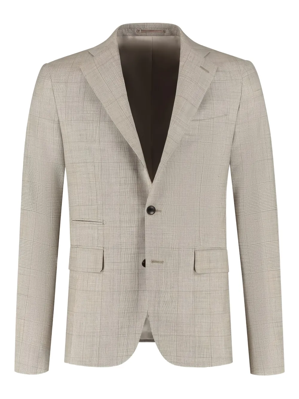Бежевый клетчатый узор, застежка на две пуговицы, карманы с клапанами, отложной воротник