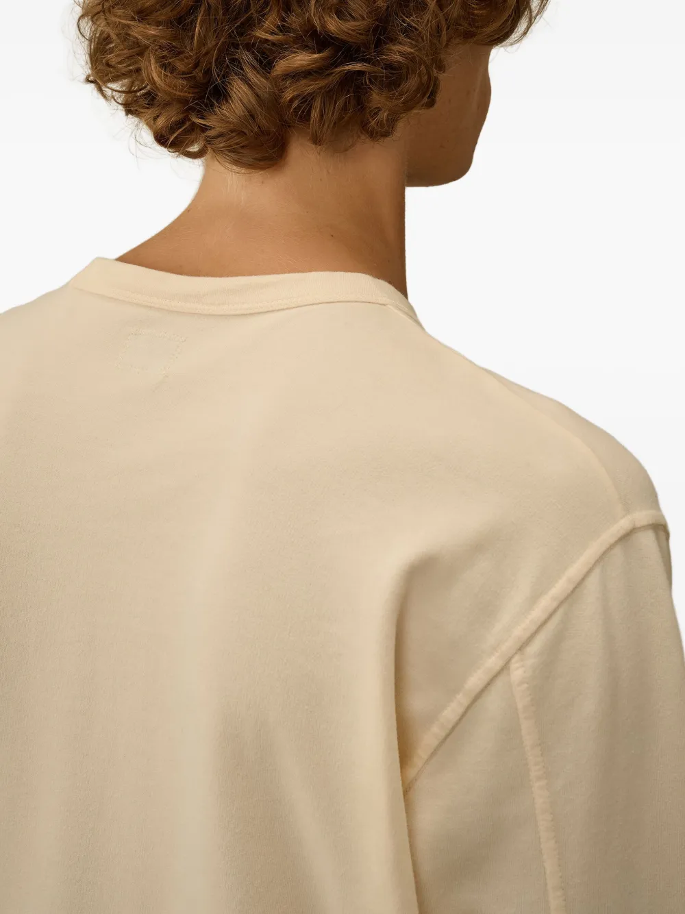 Бежевый хлопок, круглый вырез горловины, длинные рукава, карманы, деталь на рукаве, подпись, деталь на линзах. Компания CP Company рекомендует снимать все съемные аксессуары перед стиркой.