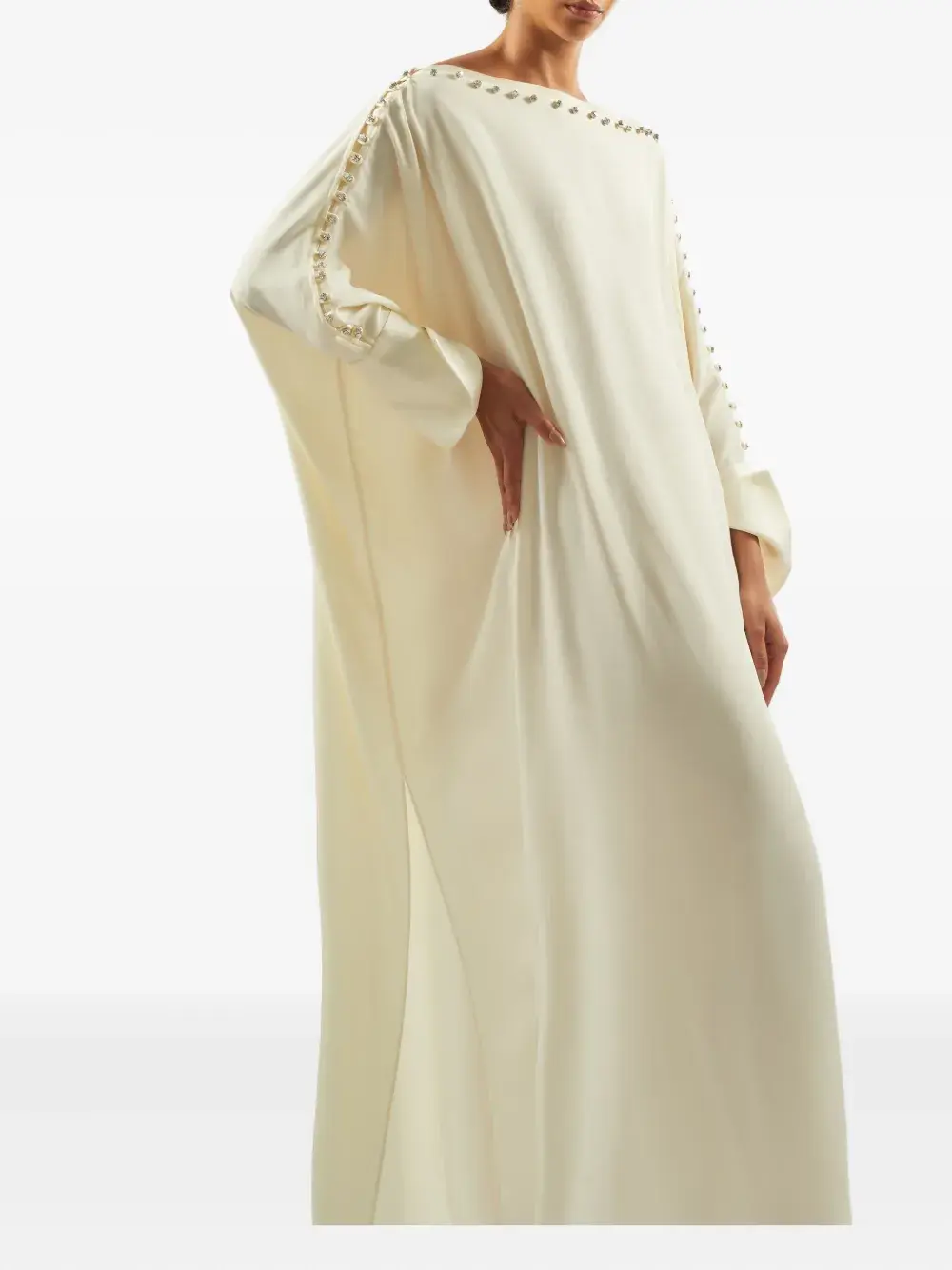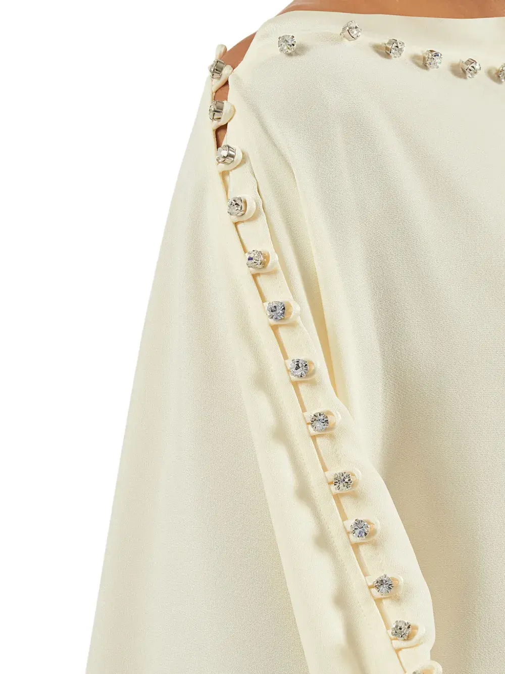 Светло-бежевые украшения из кристаллов, вырез «лодочка», длинные рукава, асимметричный подол, свободный крой