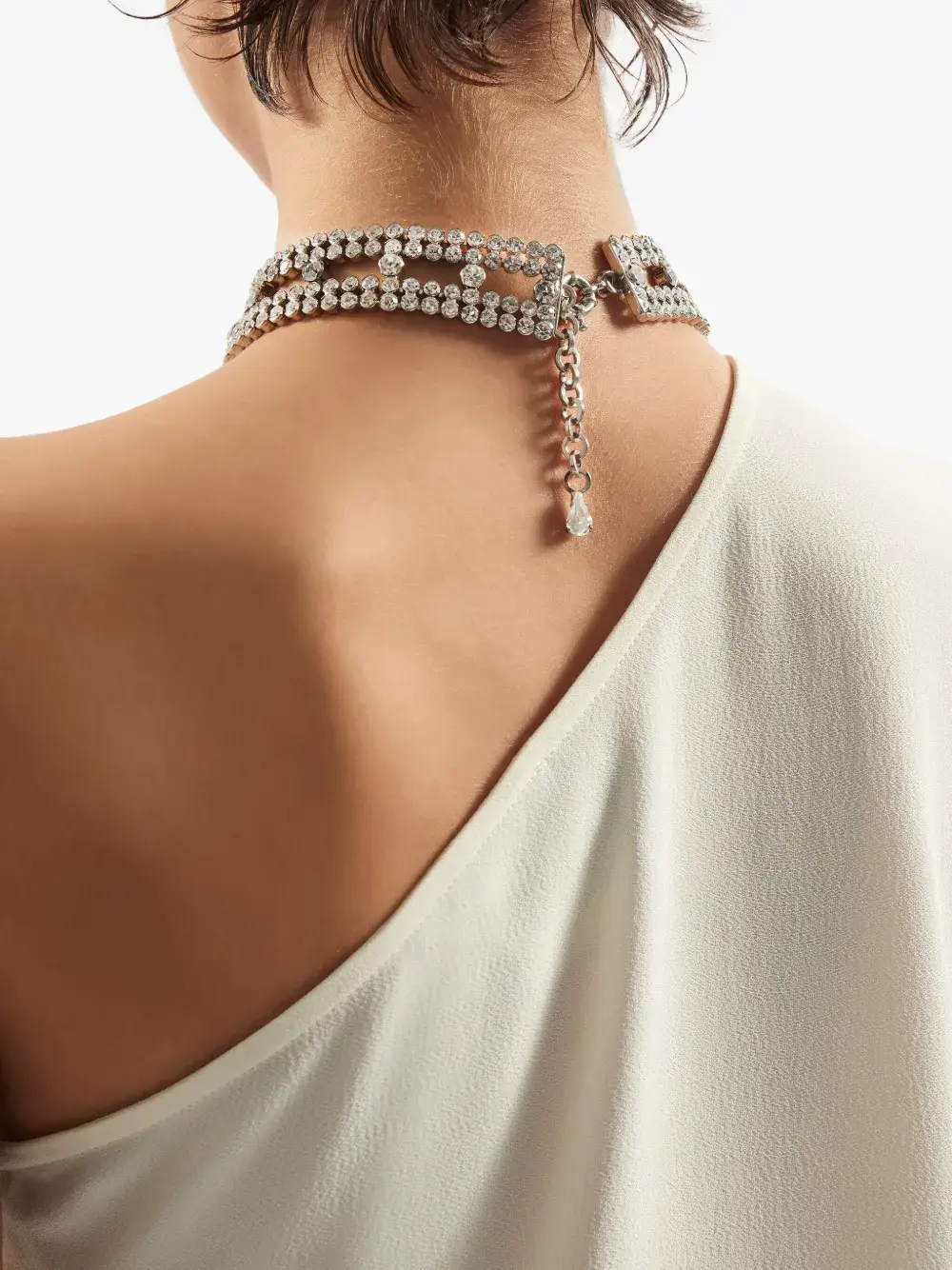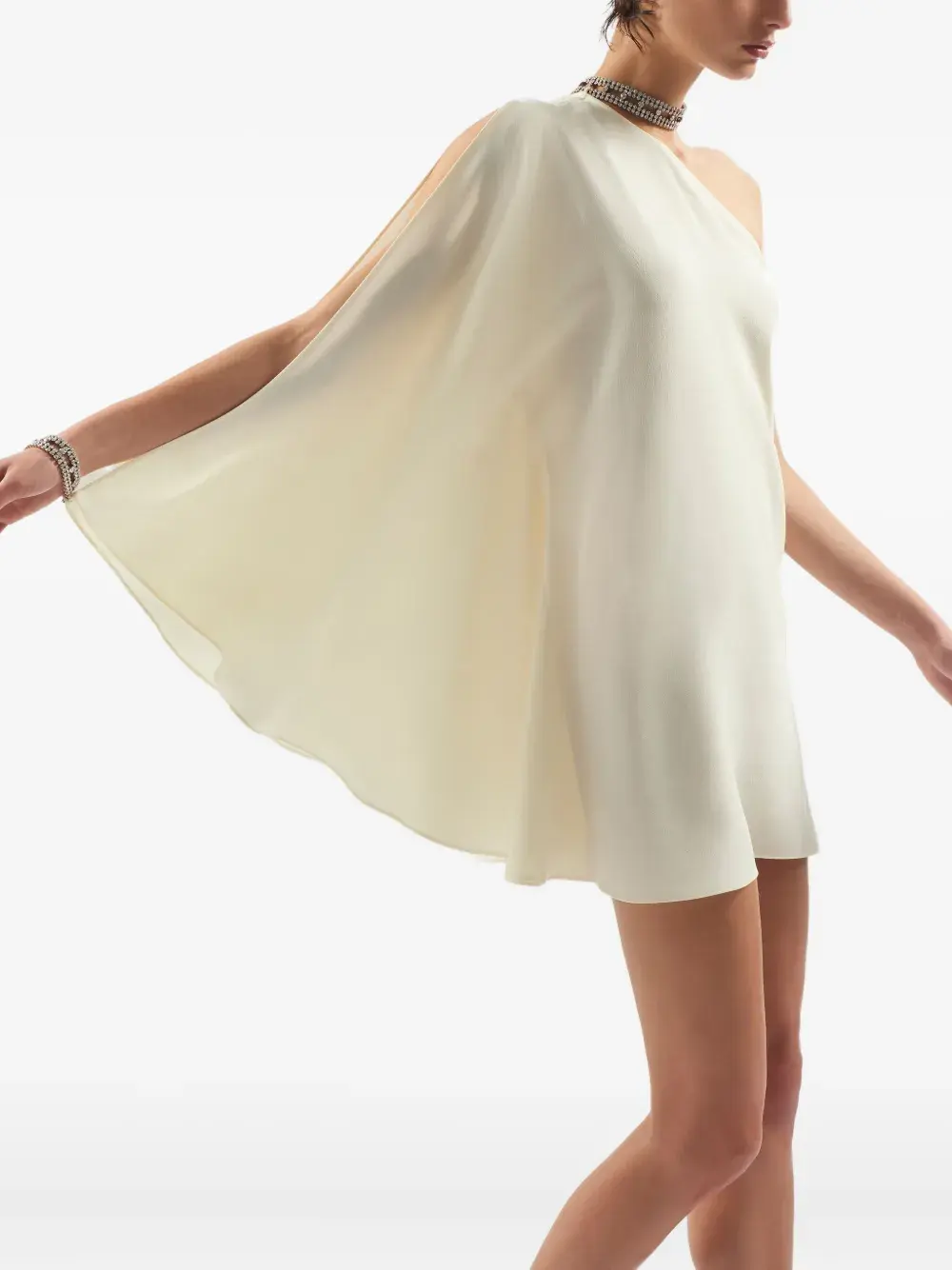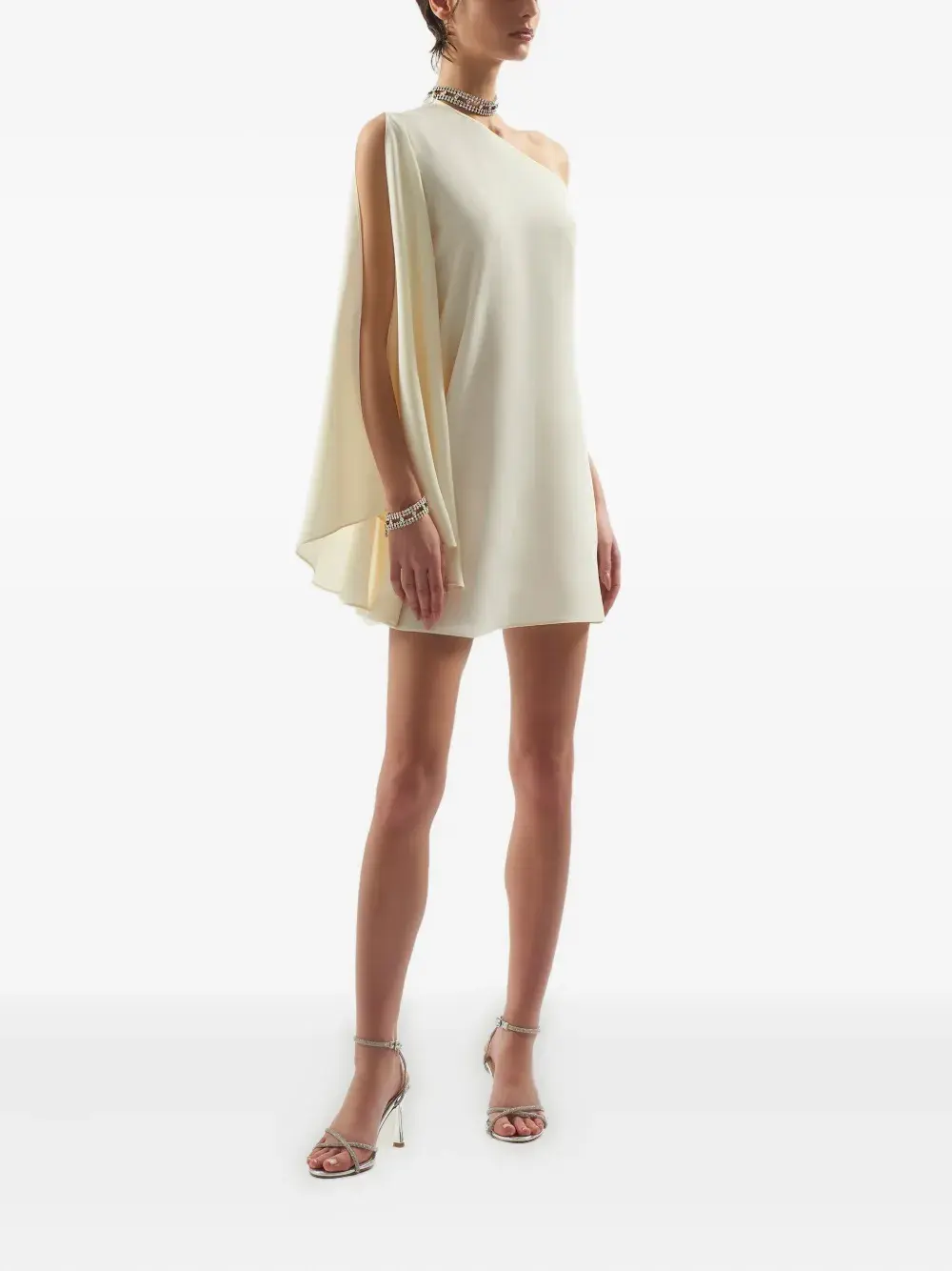 Светло-бежевый, на одно плечо, рукав-накидка, длина мини, украшение из кристаллов, прямой подол