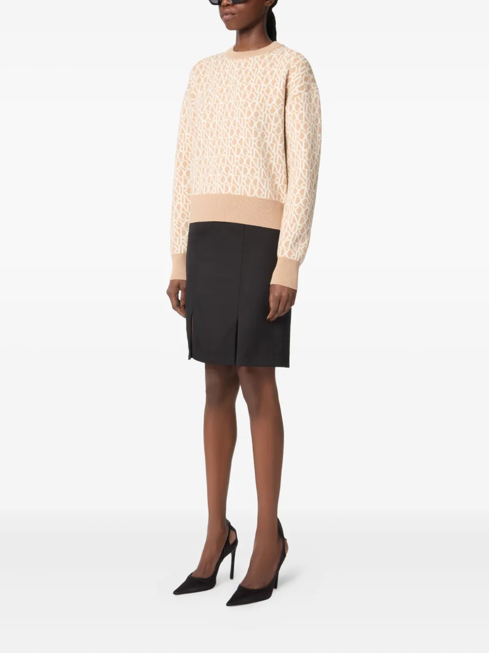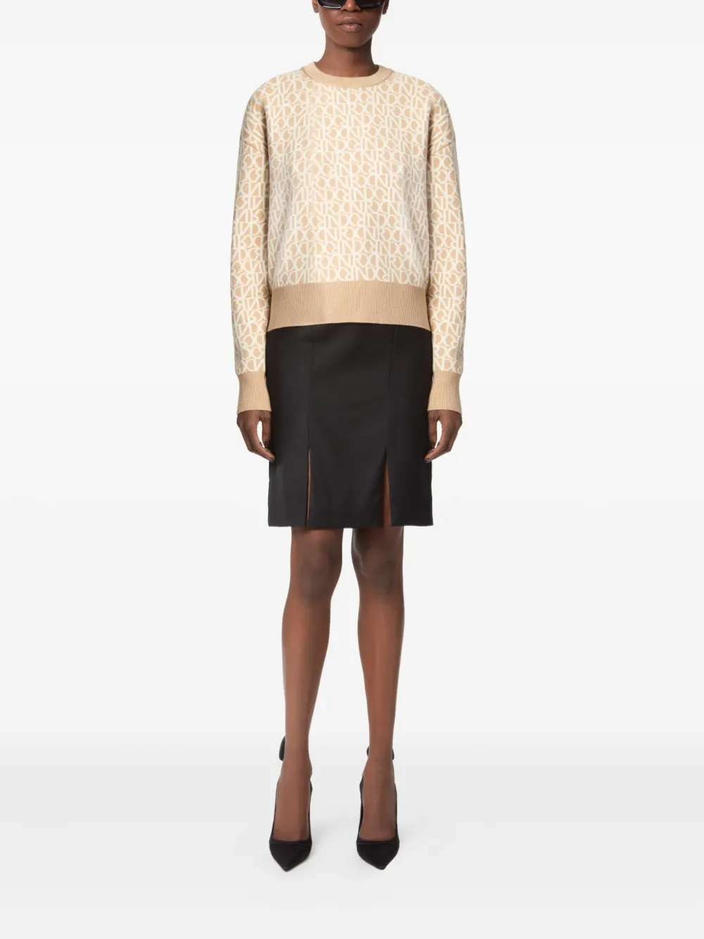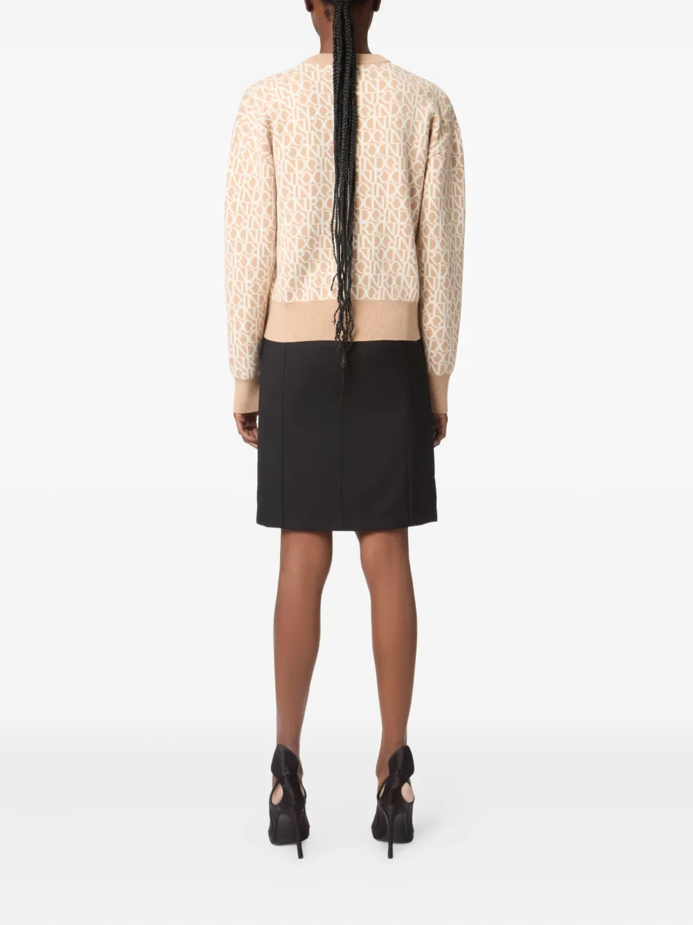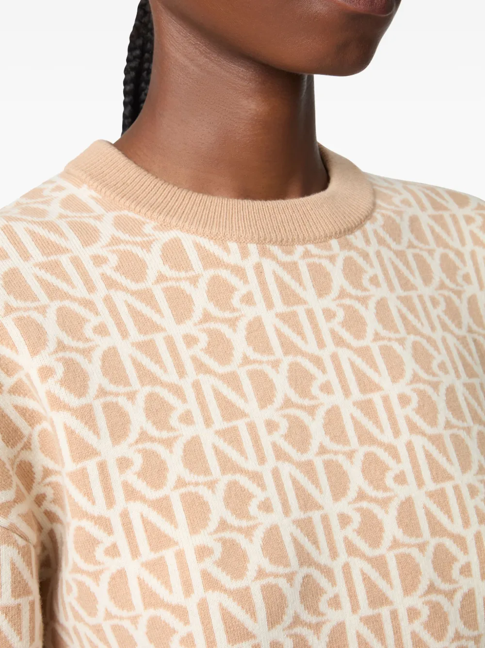 Бежевая шерсть, узор из монограмм по всей поверхности, круглый вырез горловины, длинные рукава, ребристый подол