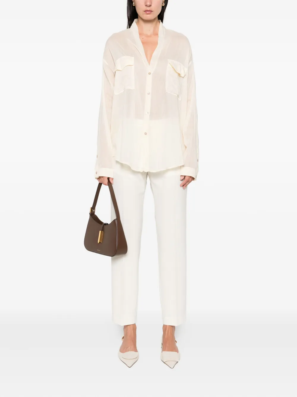 Светло-бежевый, длинные рукава, застежка на пуговицы, воротник-стойка, карманы с клапанами, свободный крой