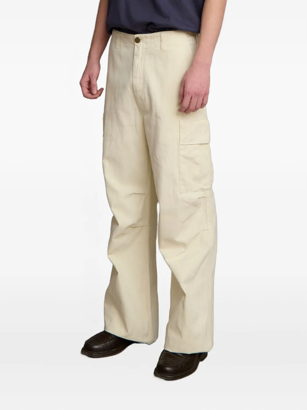 Не совсем белый, с рисунком «елочка», карманы-карго, ширинка на пуговицах, прямой покрой, хлопковая конструкция