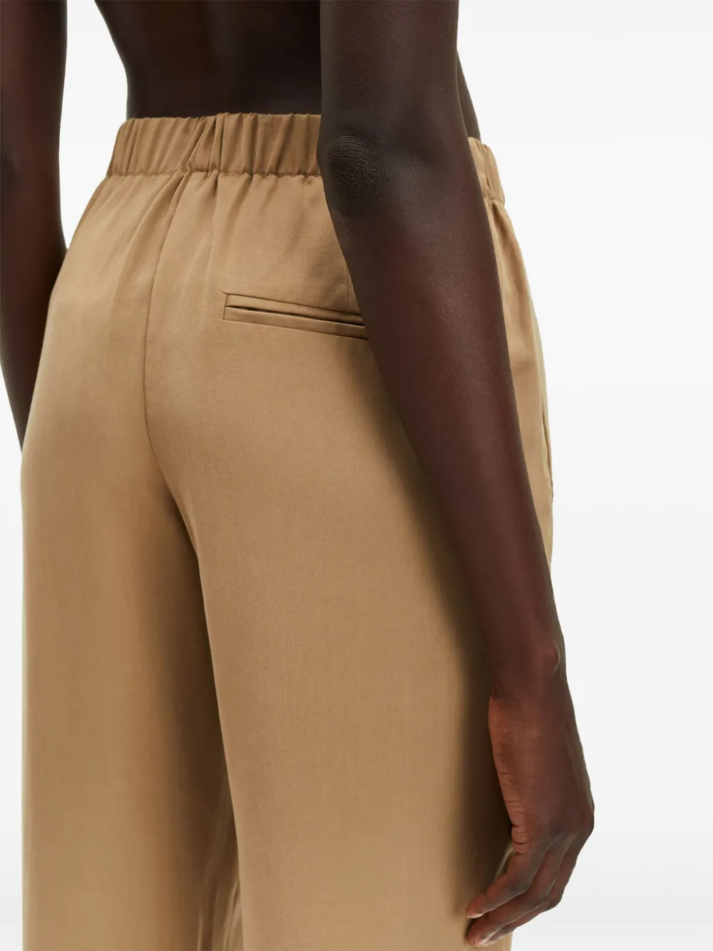 Резинка на талии, зауженные брючины, прямые карманы, прорезные карманы сзади, манжеты на подгибе