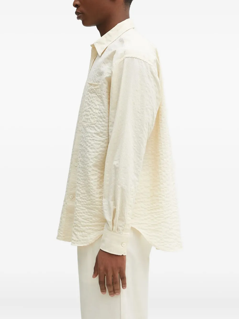 Застежка на пуговицы из фактурной ткани кремового цвета, длинные рукава, классический воротник, нагрудный карман