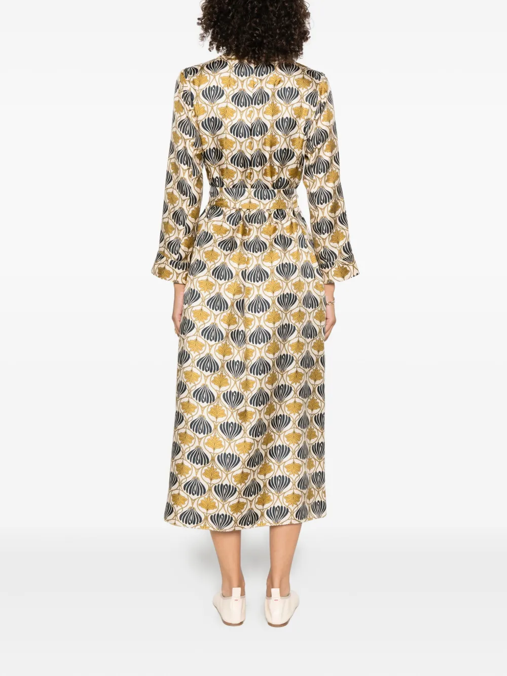 Желтый геометрический узор, пуговицы спереди, рукава три четверти, завязывающийся пояс, шелковый материал