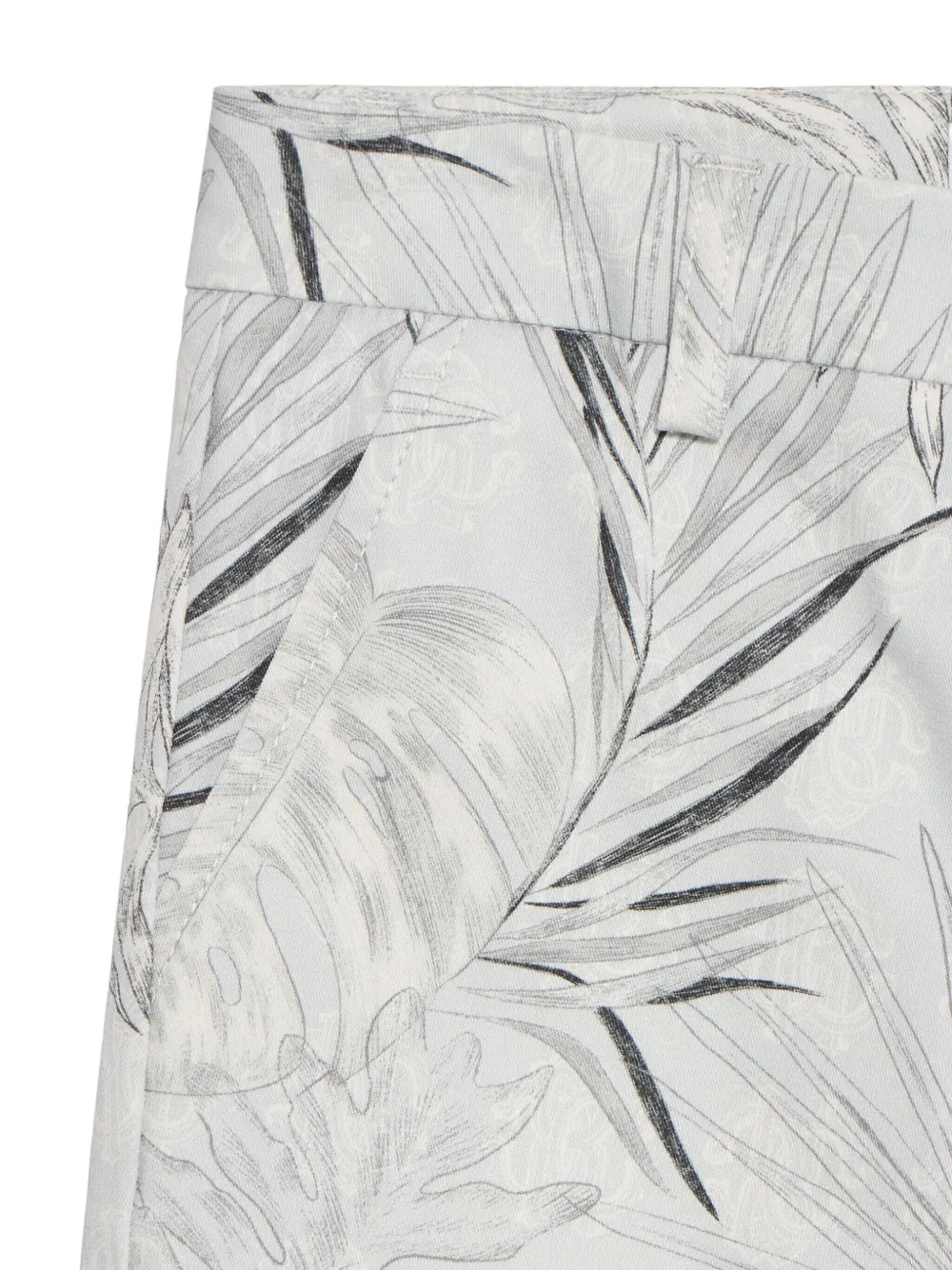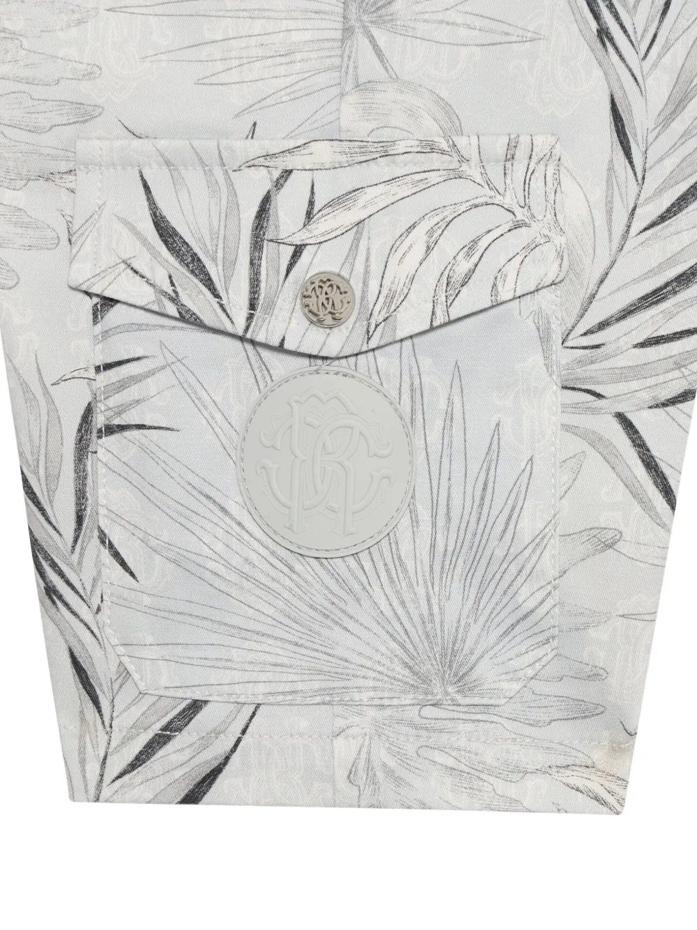 Светло-серый принт с листвой, карманы-карго, застежка на пуговицы, фирменная нашивка, плоский перед