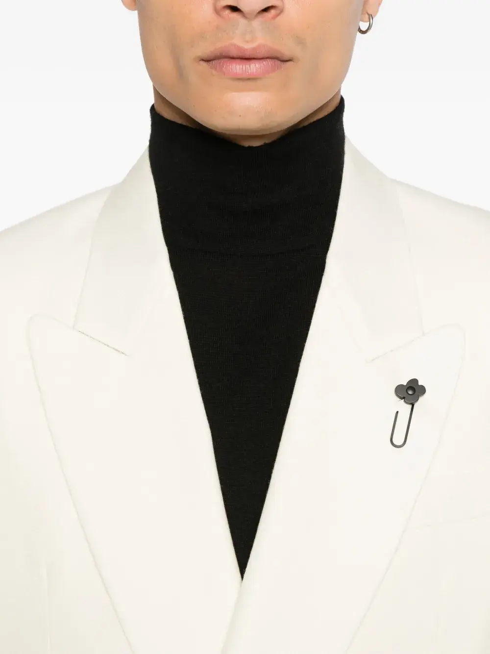 Двубортный пиджак кремового цвета с заостренными лацканами, застежкой на пуговицы, прорезными карманами и брошью