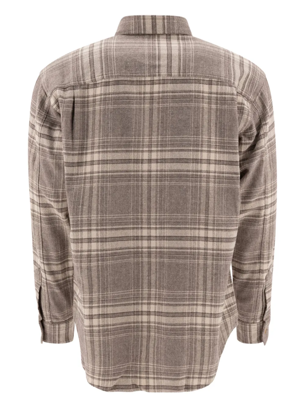 Бежевый клетчатый узор, застежка на пуговицы, классический воротник, накладной карман, длинные рукава