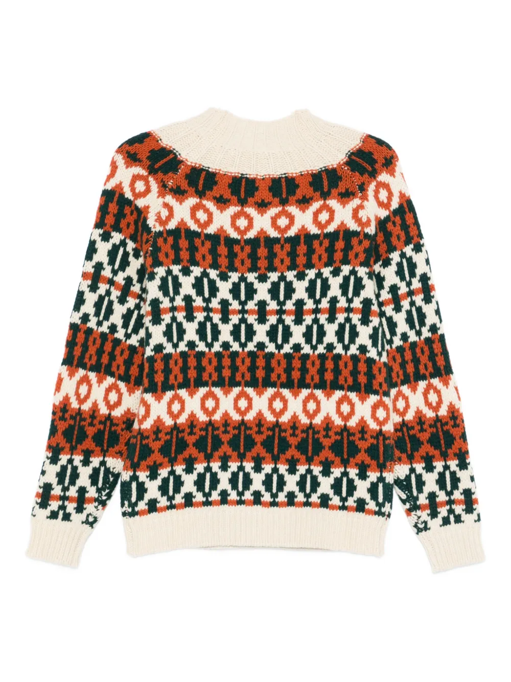 Светло-бежевая мериносовая шерсть, фэр-айл, интарсия, воротник-стойка, длинные рукава, ребристые манжеты