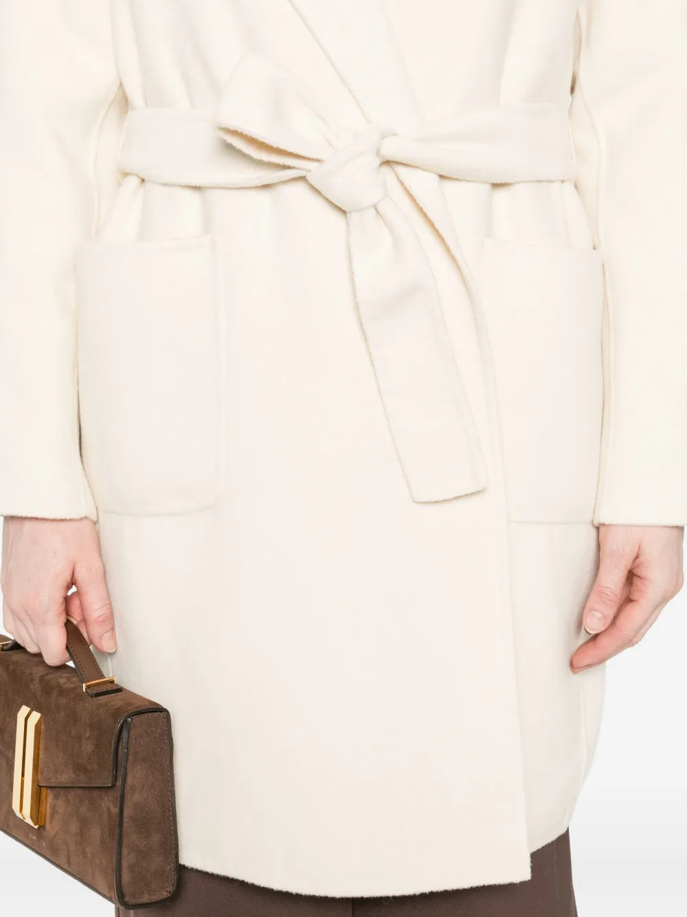 Кремовый, с капюшоном, завязывающимся поясом, накладными карманами, длинными рукавами
